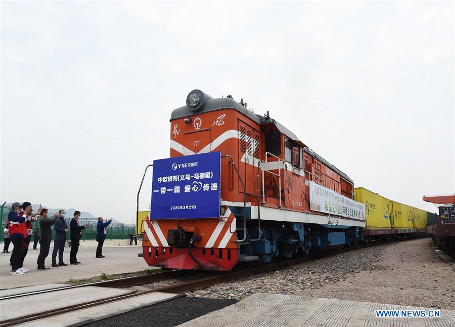 HANGZHOU, March 21 (Xinhua) -- A freight train carrying donated face masks and other anti-coronavirus supplies departed Yiwu city in east China Saturday morning for Madrid, Spain.