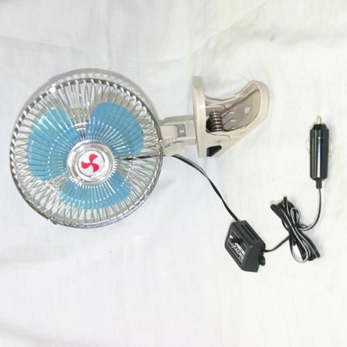 A 12V white aluminum and plastic car fan, which is designed to connect to the vehicle's power source with a white color. It has a diameter of about 30CM and is not at all bulky. It can rotate freely in the limited space of the car and bring strong cool air.