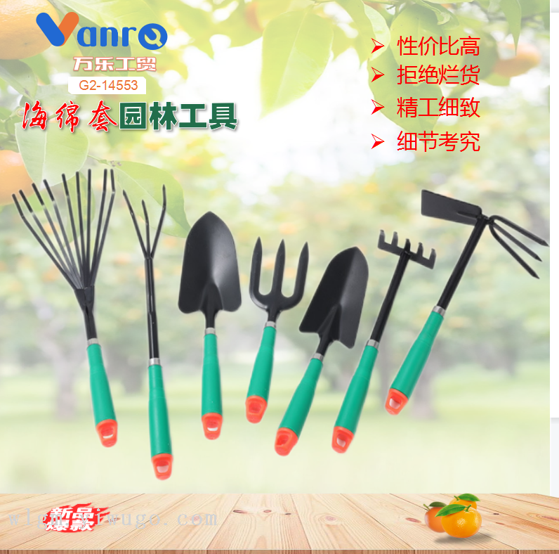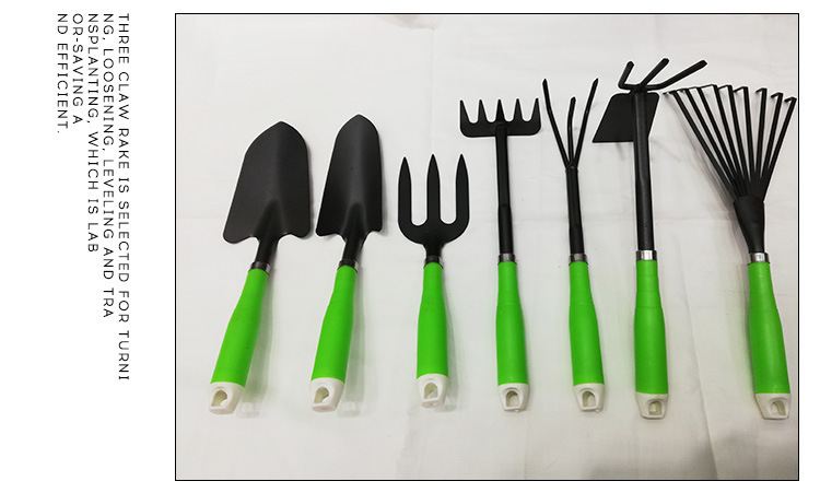 The garden set tool 7pcs is made of high-quality stainless steel material, developed and designed based on human bionics, can be operated with one hand, is compact in shape, finely sprayed plastic, and durable.