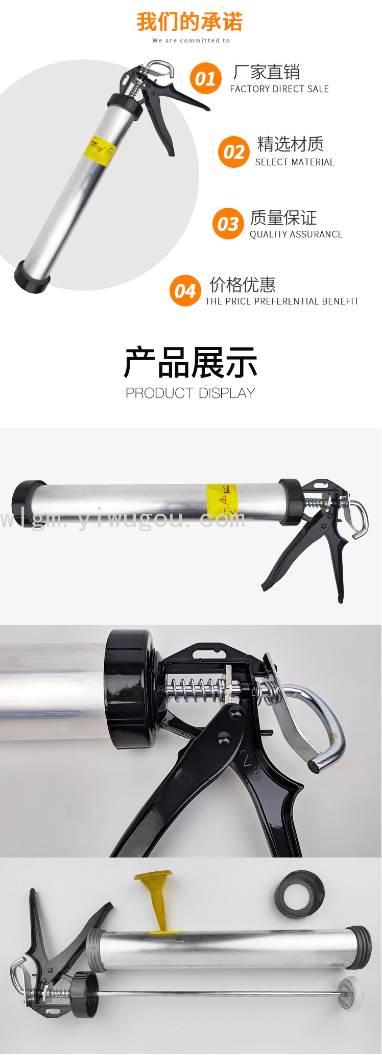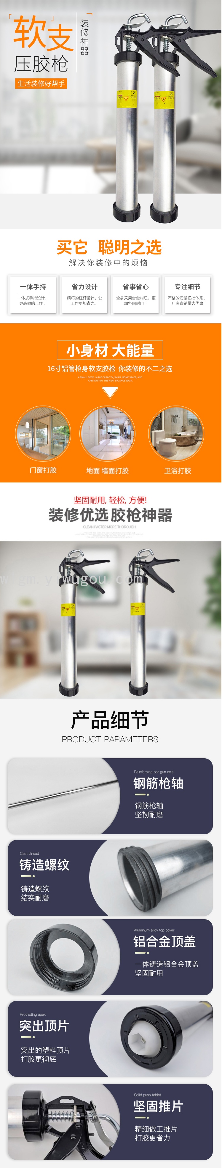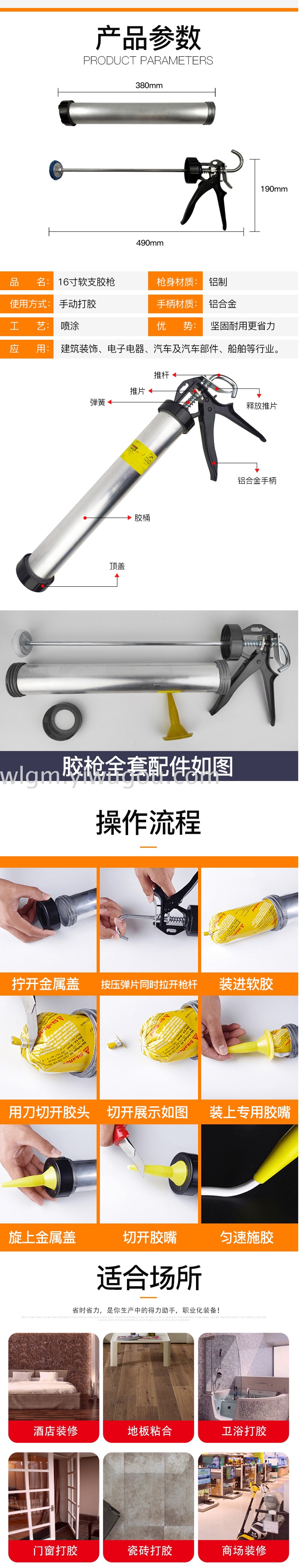 Aluminum tube pressure glue gun is used for squeezing glass glue and other tools. The product is very popular in Japan, the United States, South Korea and other countries and regions, and has won high praise from users.