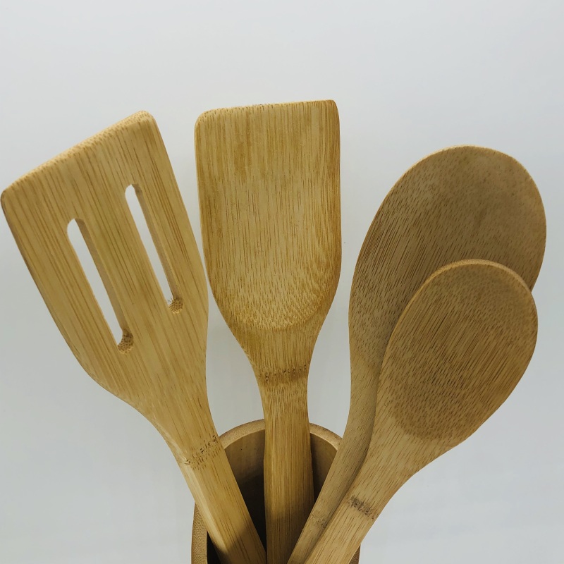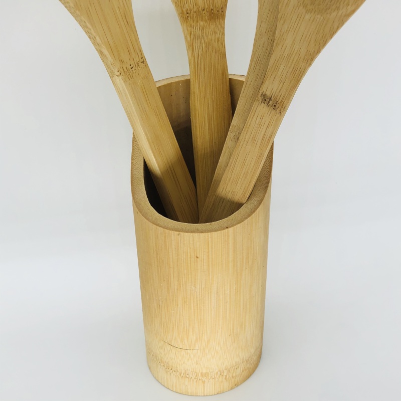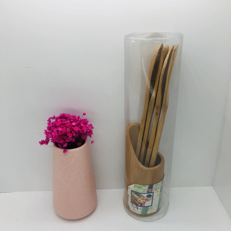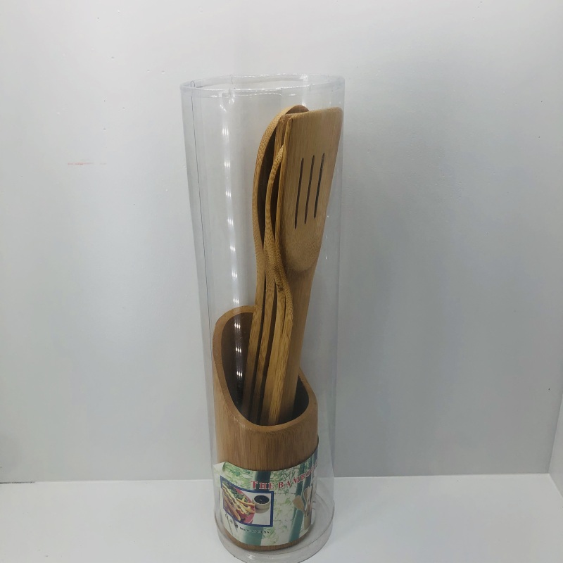 The kitchen five-piece set is meticulously crafted from natural bamboo materials, primarily suitable for frying and deep-frying foods. The kitchen five-piece set is extremely hard, with a natural and comfortable feel, especially suitable for use in kitchens of families, restaurants, and hotels. The kitchen five-piece set has a product specification of 5PC, is manufactured in China's Fujian province, and the price is negotiable. The packing specification is 60 sets per piece, with a minimum order quantity of 1 piece. The kitchen five-piece set comes with a bamboo stand to store the products. The kitchen five-piece set is designed with a cylindrical transparent plastic outer packaging, with a patterned paper card design at the bottom.