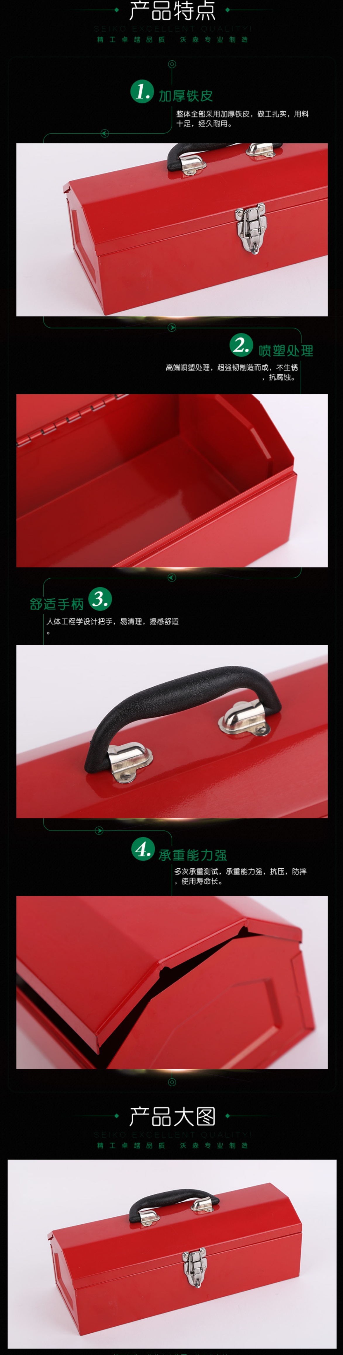 Toolbox WLJS-01 Specifications: Overall Dimensions (W*D*H): 335*155*95mm Packing Dimensions (W*D*H): 525*365*440mm Pieces/Container (pcs): 12 Net Weight/Gross Weight (kg): 13.8/14.8