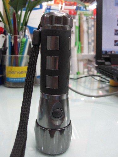 The height of the 16+1 LED aluminum alloy flashlight is 13.8 cm, the diameter of the head is 3.8 cm, and the diameter of the tail is 2.8 cm. Press the switch once to light 3 LEDs, press it again to light 6 LEDs, and then press it to turn on the bulb, and finally press it to turn off. The 6+1 LED flashlight is a new product that combines aluminum alloy and plastic. It is the first choice for families and outdoor enthusiasts. The product is packaged in a single piece of 72 pieces, with double bubble shell and sucker, and the middle box has 12 pieces.