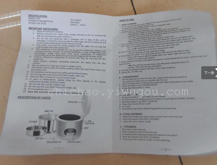 1.8 l 700w stainless steel rice cooker 中文版
