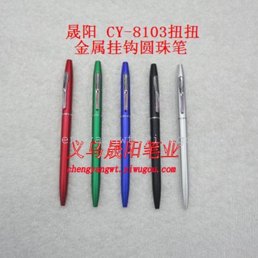 CY-8103 metal hook twist ball pen material ABS AS material production, not easy to crack, Office, printing LOGO promotional products gifts necessary for writing pen, ball pen refills with Shanghai ink, antioxidant does not fade, spray with water, writing fluency, smooth, colorful, durable hard to dry.