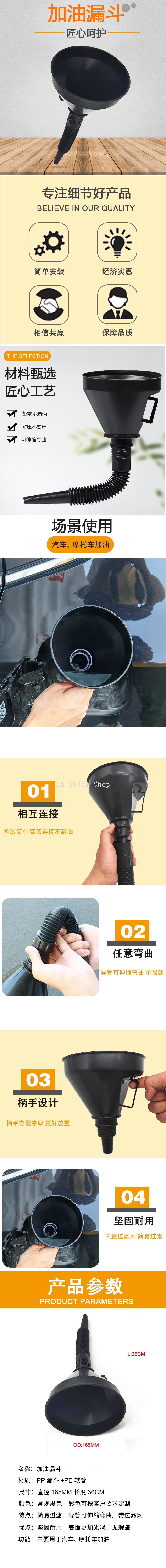 Features: Specialized for cars and motorcycles, oil funnel with filter mesh, convenient and quick oil filling!