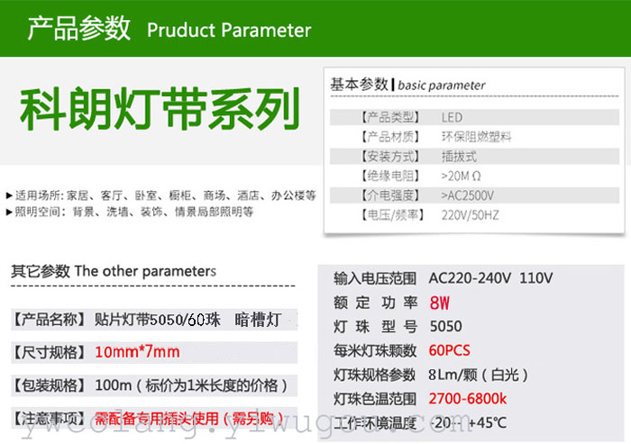 产品名称 220V贴片灯带5050/60珠暗槽灯