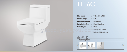 SIZEmm:710*360*705 WATER USAGE:5.8L FLUSHING SYSTEM:SIPHON JET INSTALLATION TYPE:FLOOR STANDING OUTLET TYPE:DUAL P-TRAP:H100MM S-TRAP:305/400MM