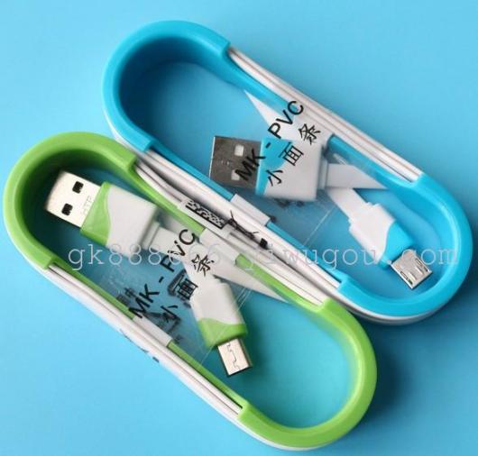 Two-color data cable charging small noodles colored noodles data cables, length 1 m, width 5CM,1.2CM thickness line, one USB, one end V8, ABS material for two divided into two colors, you can charge your electronic devices and data transmission
