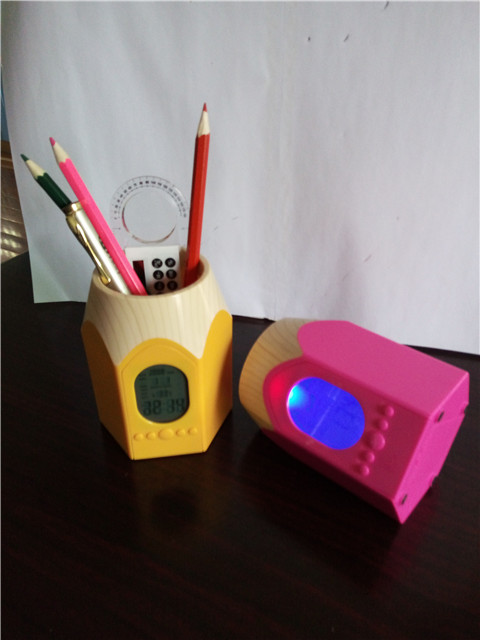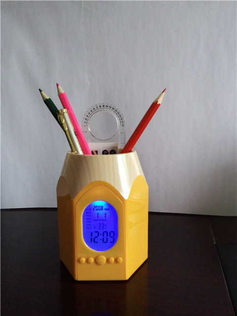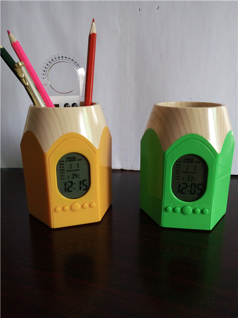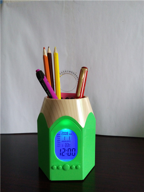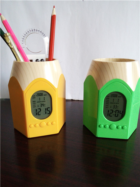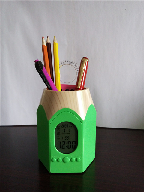 With a backlight/ LIGHTSwitch, big screen, blue backlight, full display at a glance! Classic pencil style, multicolorABS +The wood grain environmental protection plastics, is the enterprise business promotion, individual desk practical creative placement!