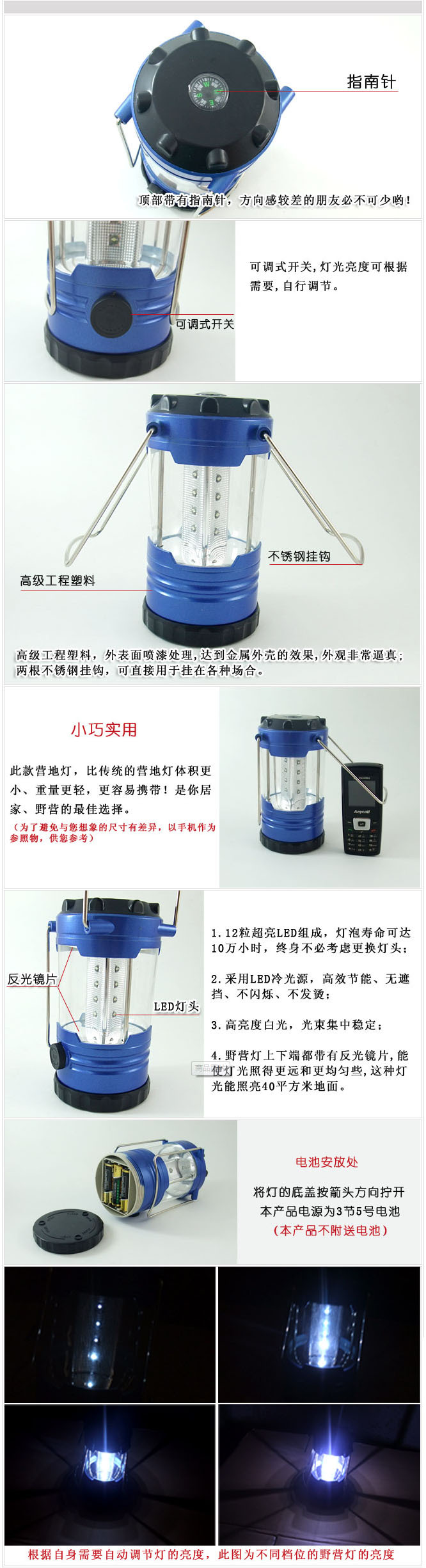5、3节5号电池供电,电池装在灯的底部,打开电池盒盖(本出售产品不含有电池,勿用充电电池和南孚高容量电池等)