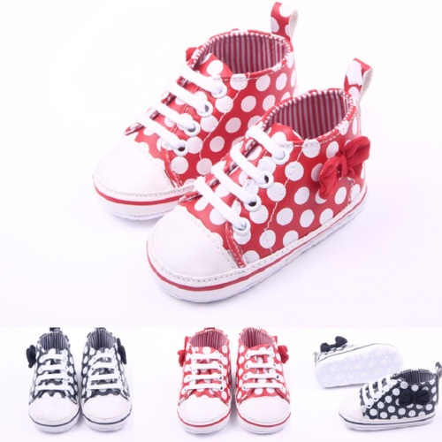 Upper material: Artificial PU Sole material: Dot-print canvas bottom Wearing method: Front lacing Trendy elements: Bow tie Suitable age: 0-1 year old baby