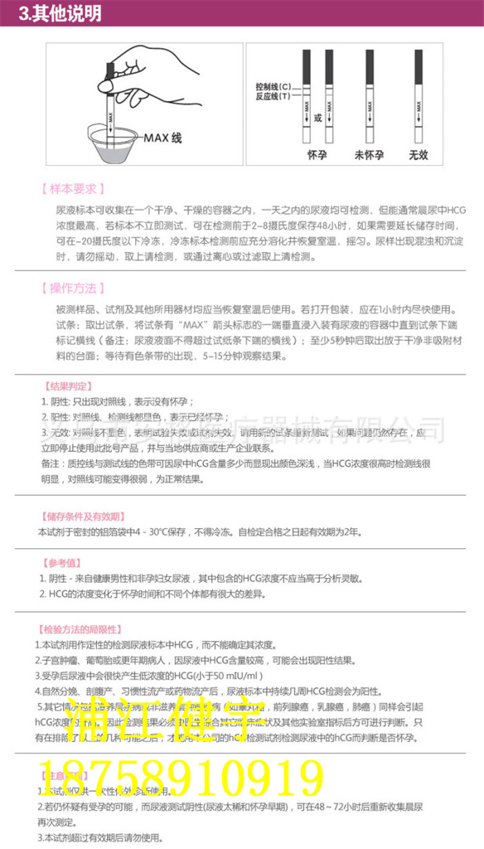 6、若被测试者怀疑有受孕的可能,而尿液测试阴性,可在48-72小时后重新收集晨尿再次测定。
