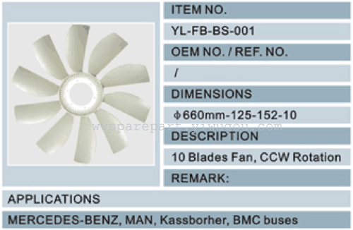 About Product:ITEM NO:YL-FB-BS-001 OEM NO./REF.NO:/ DIMENSIONS:φ660MM-125-152-10 DESCRIPTION:10 BLades Fan,CW R0tation REMARK:APPLICATIONS MERCEDES-BENZ,MAN,Kassborher,BMC buses