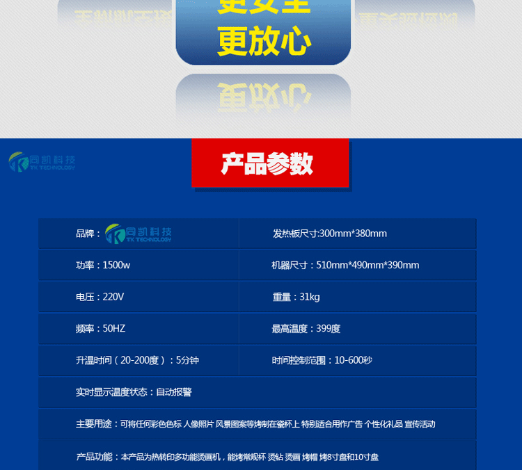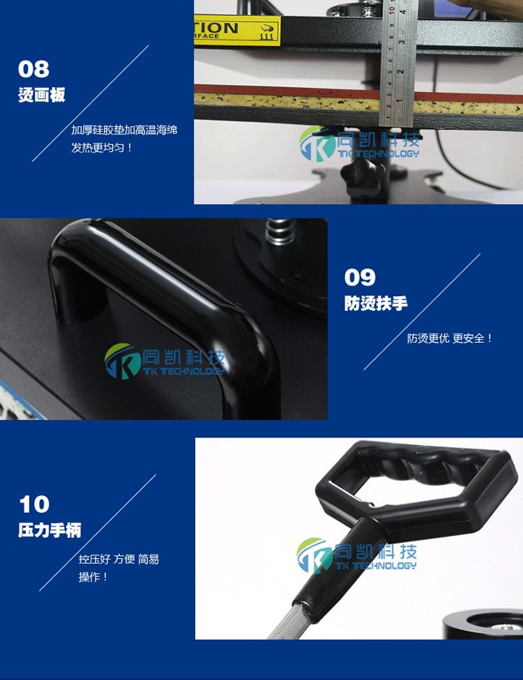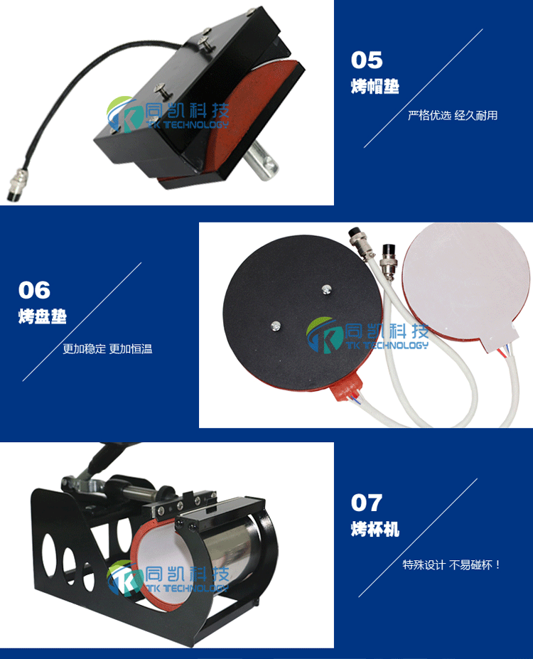 This product is a multifunctional heat transfer machine, can bake conventional cup small cup, hot drilling, heat transfer, baked baked cap, 8 inch disk, 10 inch disk, printed T-shirts, mouse pad, pillow, puzzle, porcelain, metal plate and so on, the use of a machine, suitable for users of the new shop.