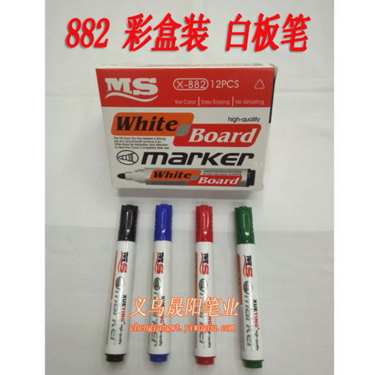 882-12 boxed whiteboard pen new PP material material production, not easy to crack, colors are green, black, red, blue, the special elements of the ink, comply with safety standards, color bright, easy to clean, leaving no trace, good writing and durable. use safety no dust, no pollution, smooth writing, Shun slide, color bright, clear handwriting, quality assurance. Whiteboard pen is suitable for primary and secondary schools, colleges and universities, all kinds of training institutions, the necessary teaching tools; enterprises, administrative organs, meeting rooms, office tools, can be written on a variety of whiteboard markers.