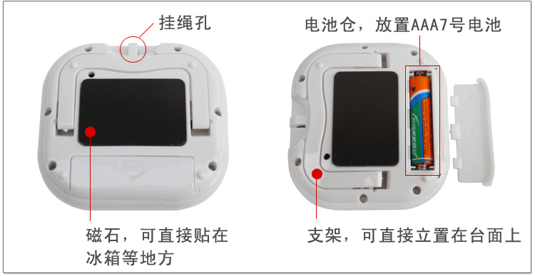 4.背面有塑胶磁铁和支架.可以吸附在冰箱壁上,金属表面或放置桌面或者悬挂。(背面的磁条是用不干胶粘上去的,不是非常牢固,建议拉出背面支架,可以放在桌子上用)