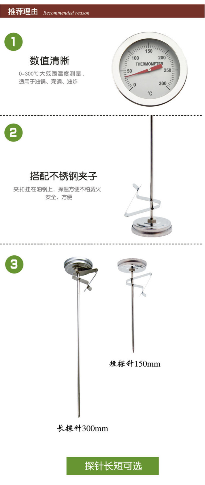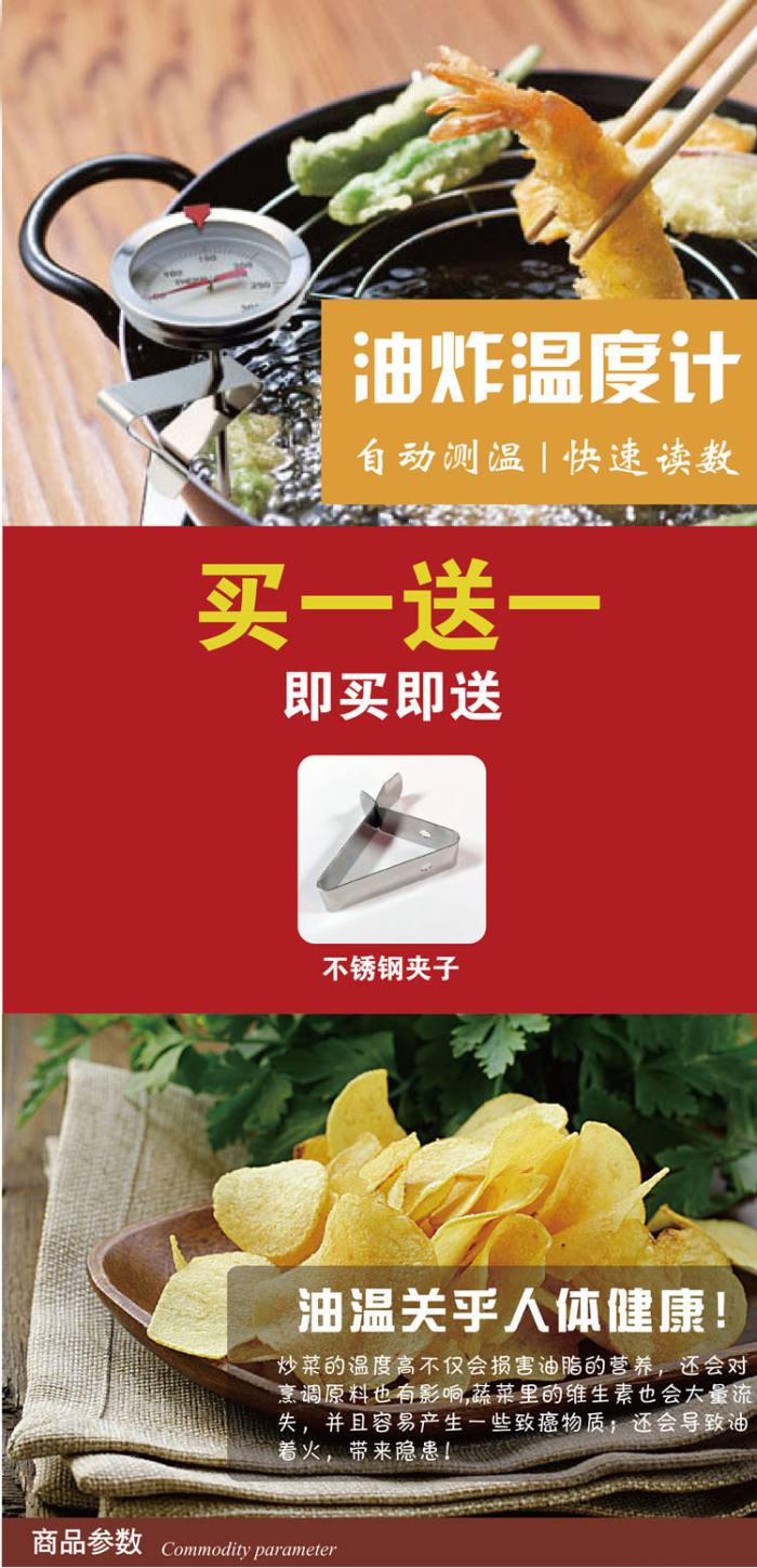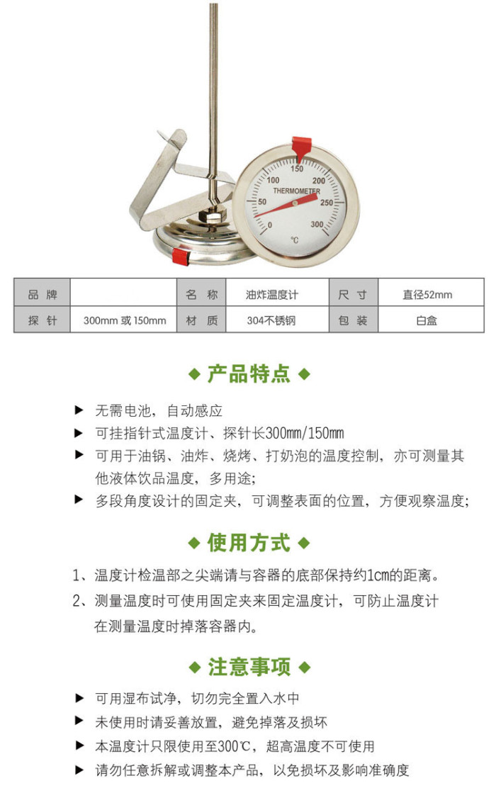 ● Can be placed reliably on the edge of the vessel, fixed very firmly, convenient to observe the oil temperature at any time;