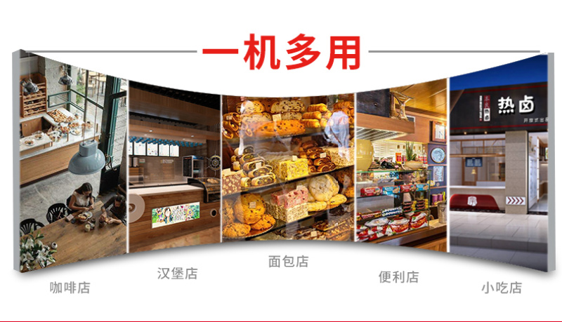 Adjustable temperature controller, temperature display, adjustable height chrome-plated shelf, rear sliding door, front advertising lightbox.
