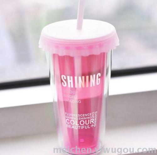 荧光双层杯吸管杯水杯杯子送女朋友生日礼物礼品塑料杯定制广告杯