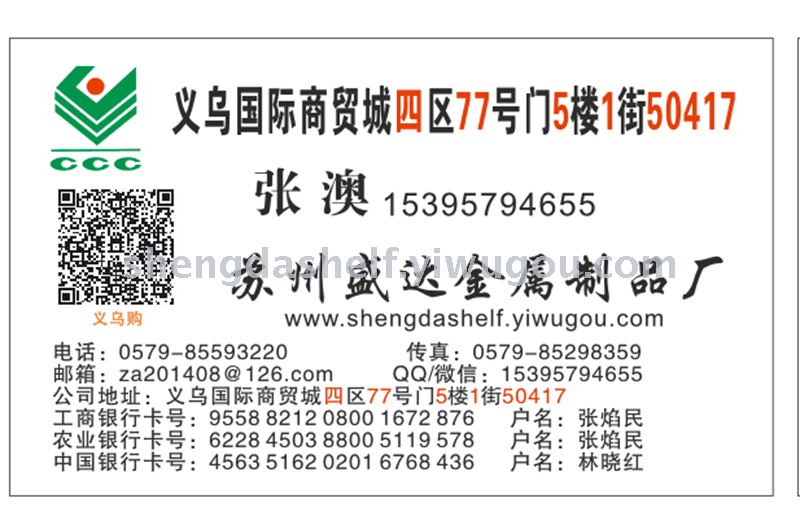 Contact: Mr. Zhang Telephone: 0579-85593220 (Beijing Time: 10:30—17:40) Fax: 0579-85298359 Mobile phone: 15395794655 E-mail: za201408@126.com WeChat: 15395794655 QQ: 3315804215 Website: http://www.shengdashelf.yiwugou.com