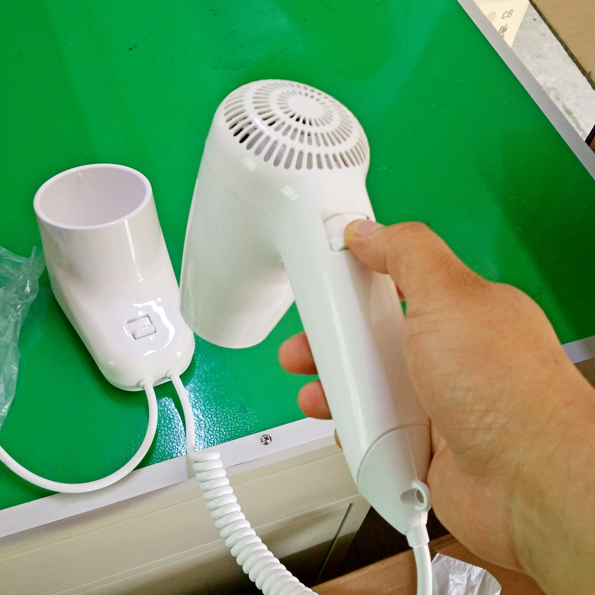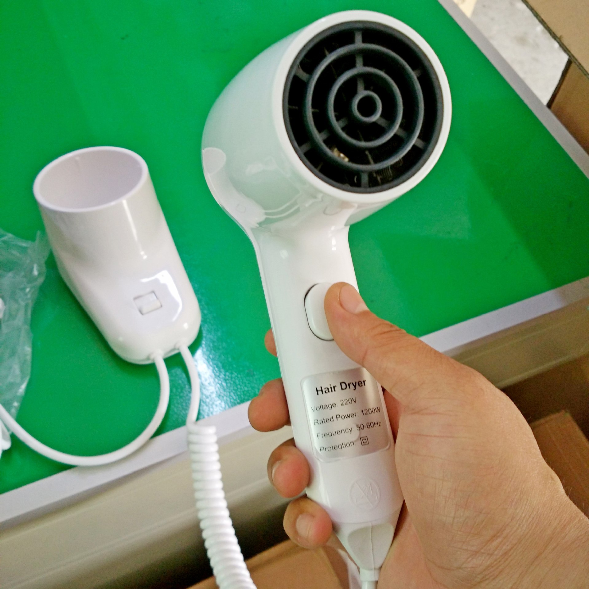 Name: pen type Hotel Hotel dedicated wall-mounted hair dryer, hair dryer ? Brand: lefeiyang, Leke home ? Voltage: 220V support foreign trade export ? Power: 1200W ? Current: 5.2A ? Use: hand-pressing type to blow, that is, to blow immediately, to stop immediately. ? Features: base with master switch, lock anti-theft function, strong wind, 1 gear and 2 Gear style switching. ? Uses: hotels, hotels, villas, high-end residential areas, baths, etc. ? Warranty: one year. 20 pieces per box This product has passed the EU local CE certification ROHS certification and the domestic 3C certification. The quality is good, the price is affordable, and the product is cost-effective.
