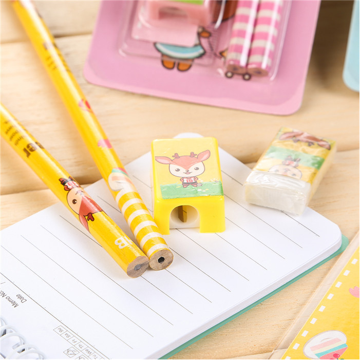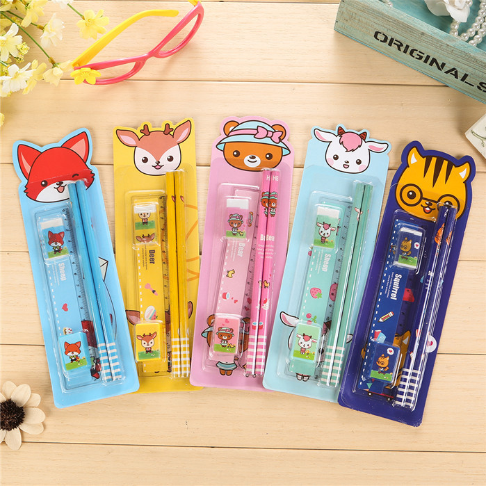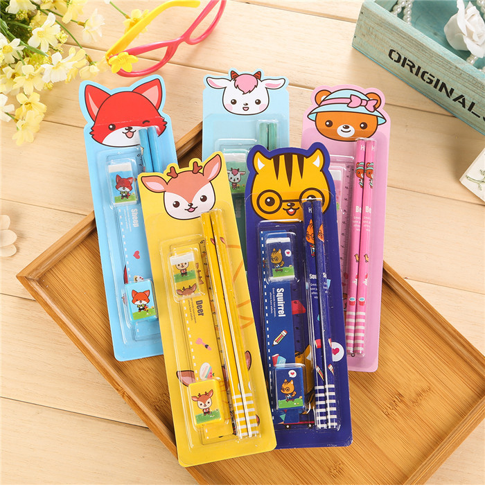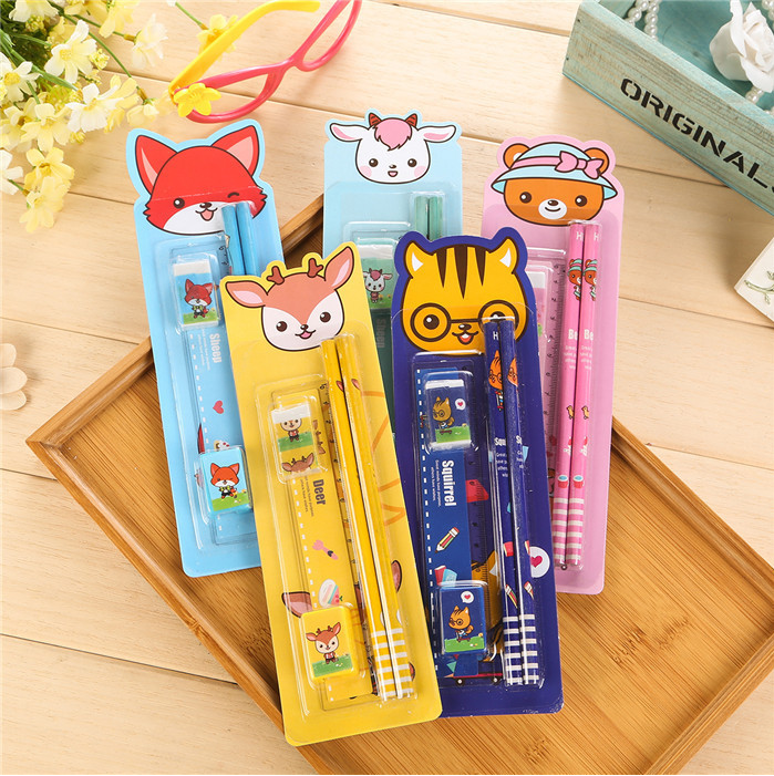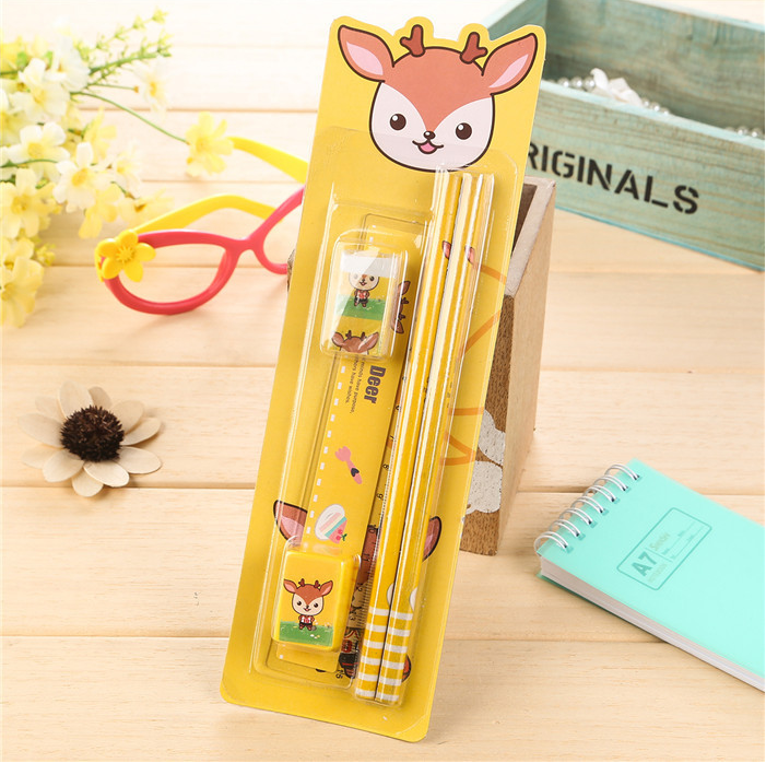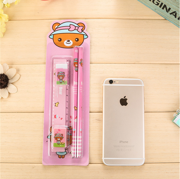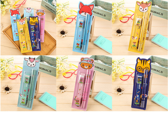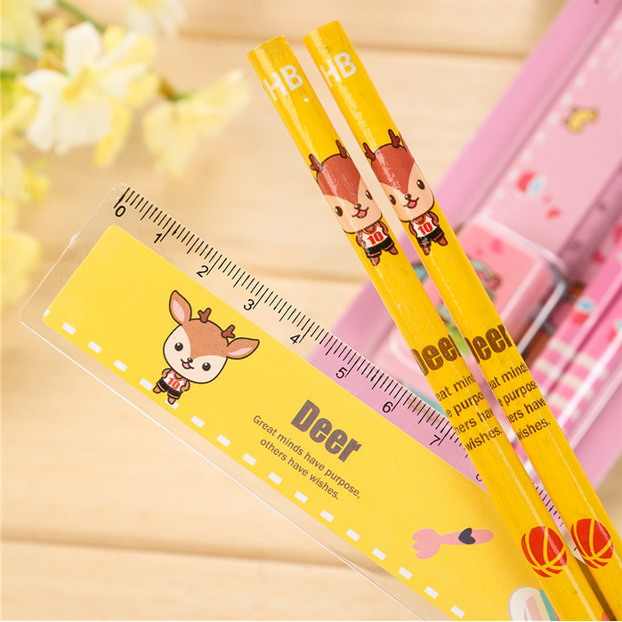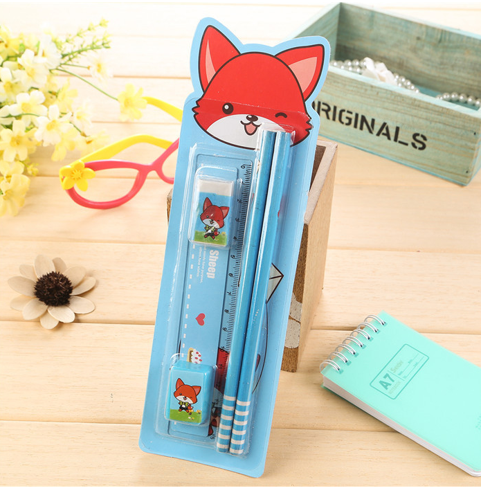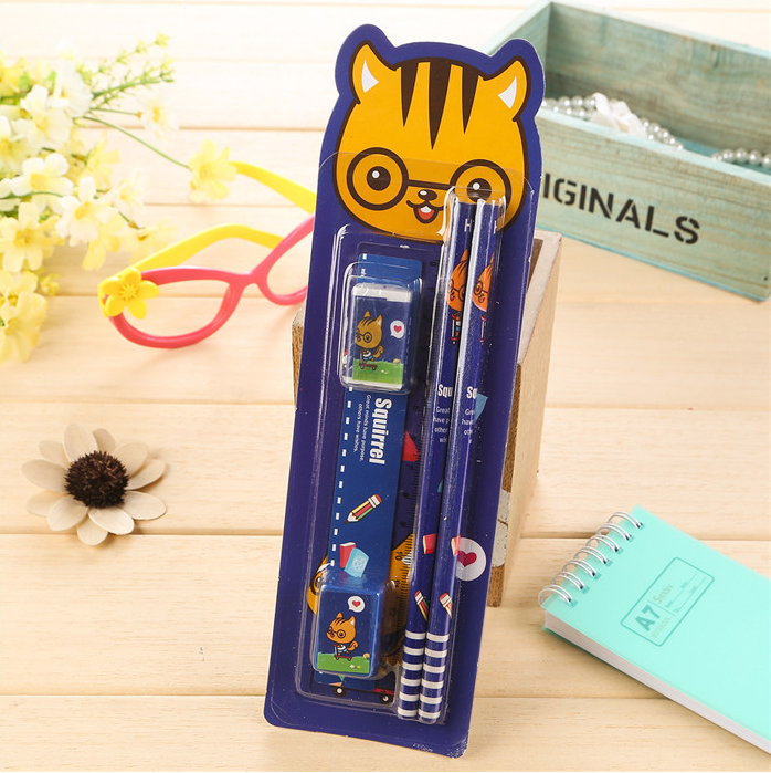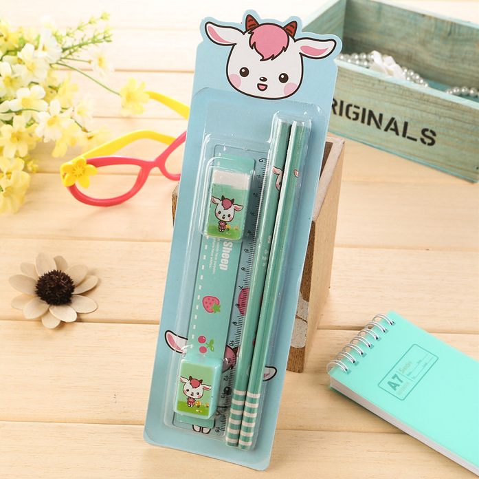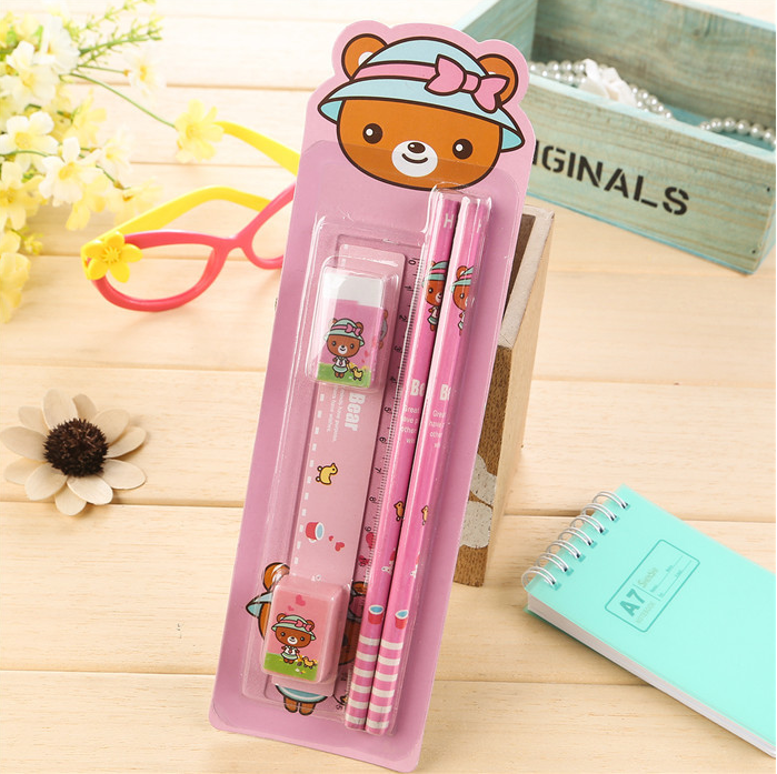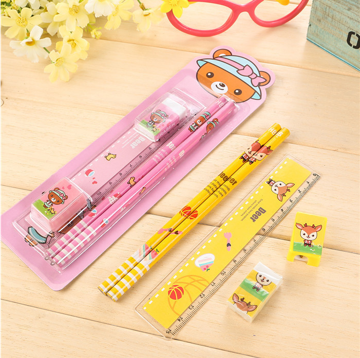 A set containing stationery: A rubber A pencil sharpener A ruler 2 pencils
