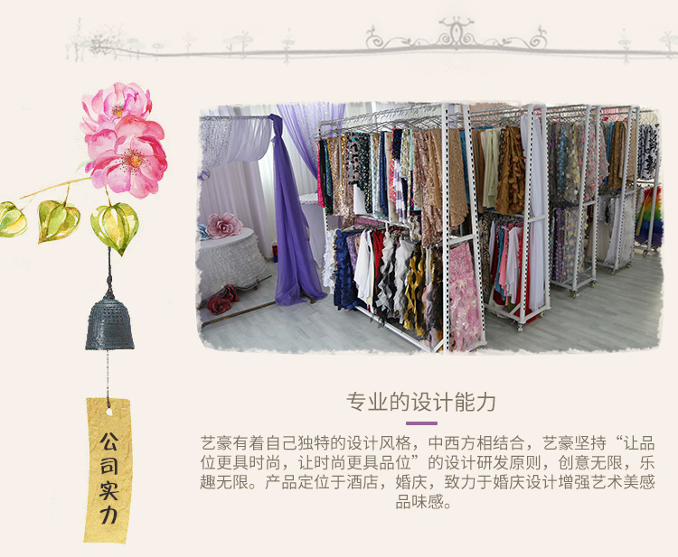 Yihao has its own unique design style. It combines China and the West. Yihao adheres to the design and research principle of "making taste more fashionable and fashionable", with unlimited creativity and fun. Products are positioned in hotels, weddings, and are dedicated to wedding design to enhance artistic beauty and taste.