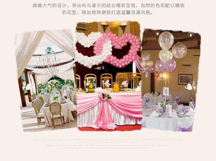 Main products: chair cover, tablecloth, chair back decoration, bowknot at chair back, chair belt, table runner table cover, napkin cushion, and other wedding supplies.