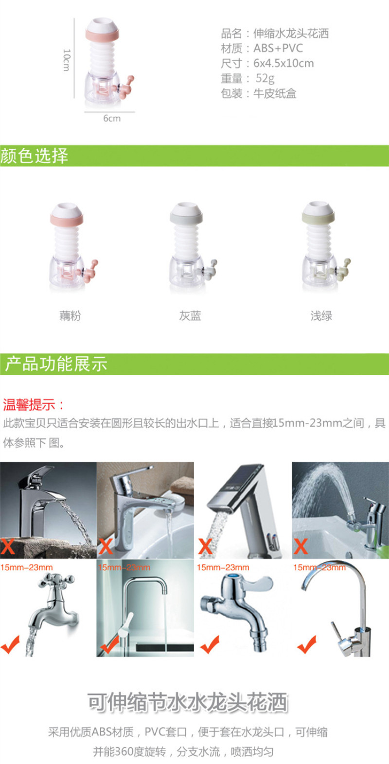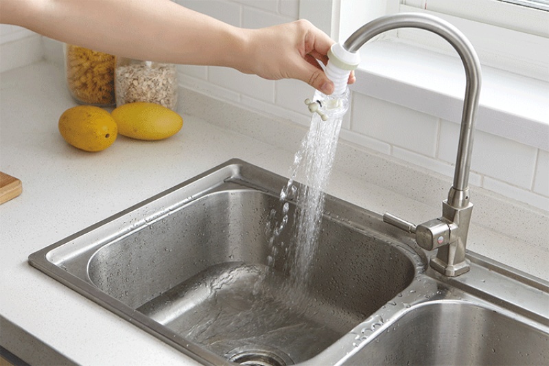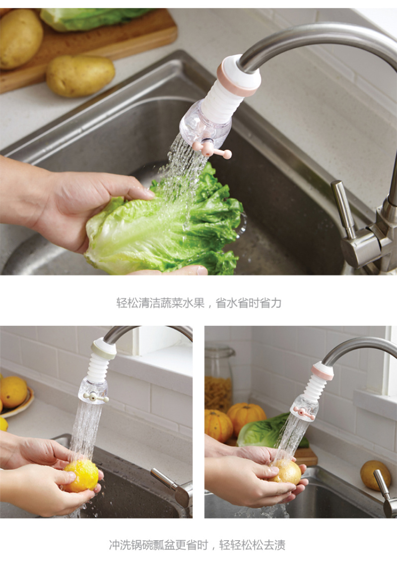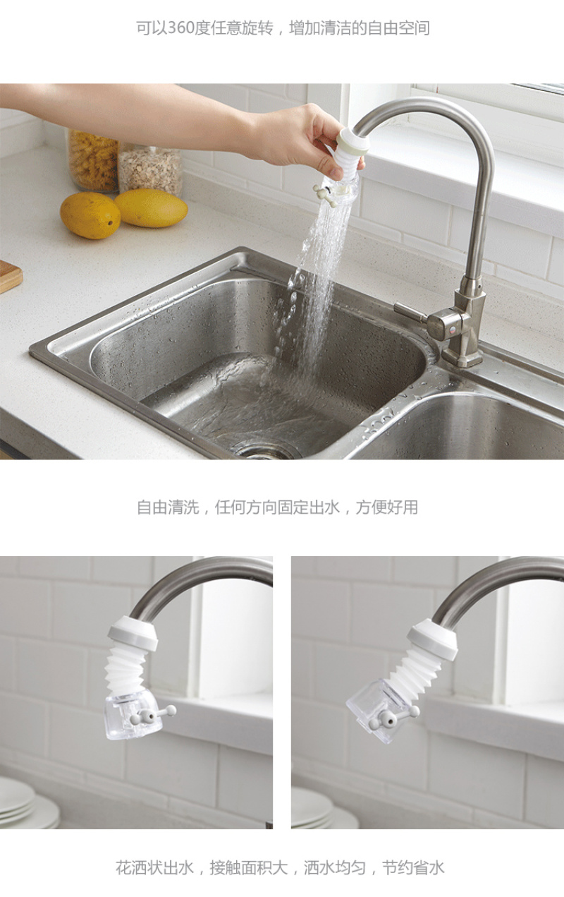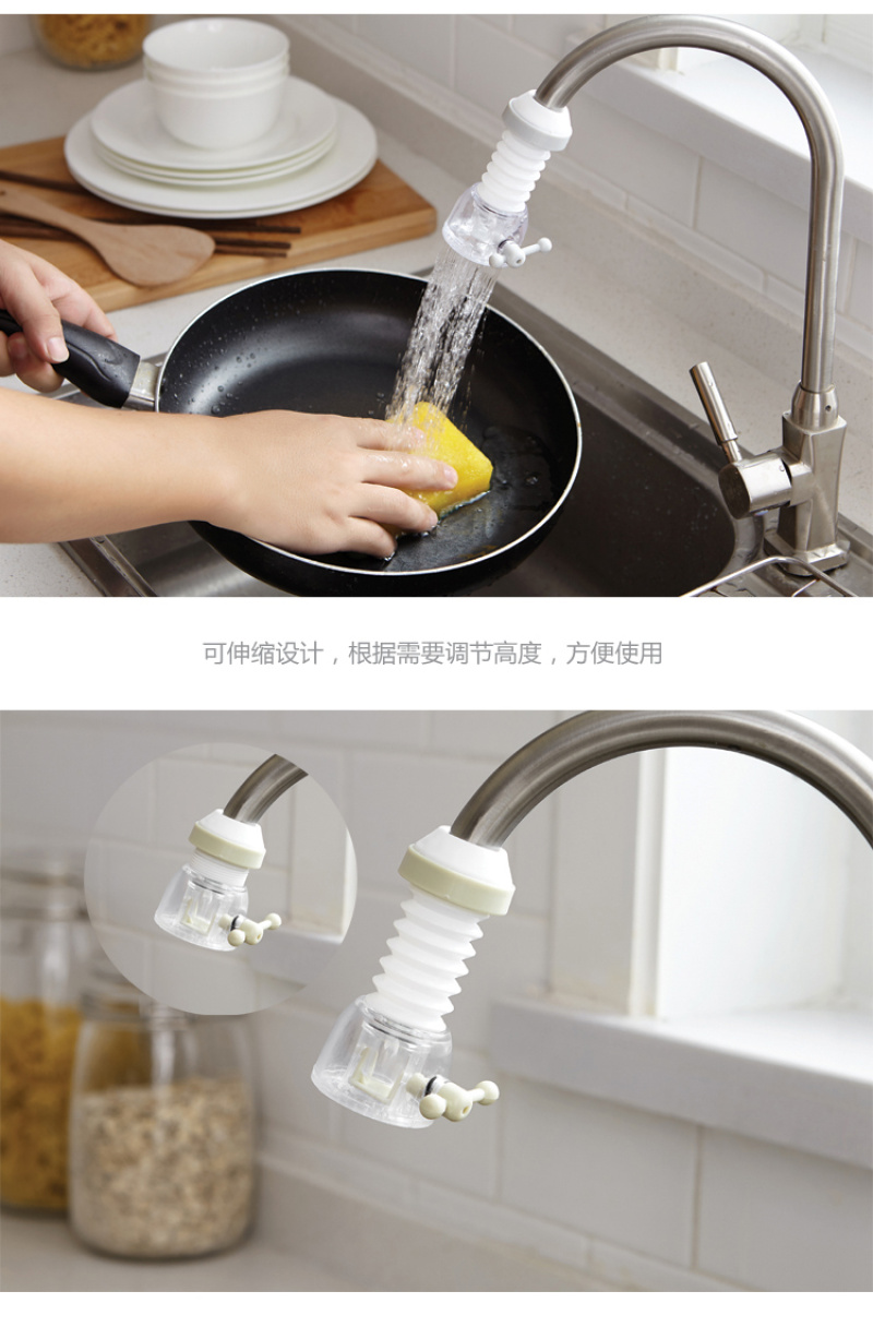 Made of ABS material, PVC material sleeve, can be fitted on the water pipe, can be extended and rotated 360 degrees, branch water flow, spraying uniformly, saving water, convenient for washing vegetables, washing dishes, etc. |