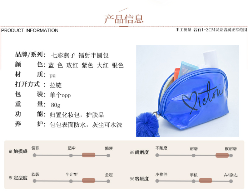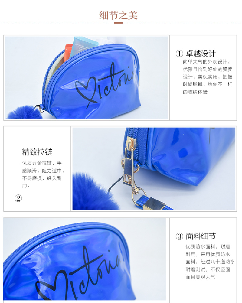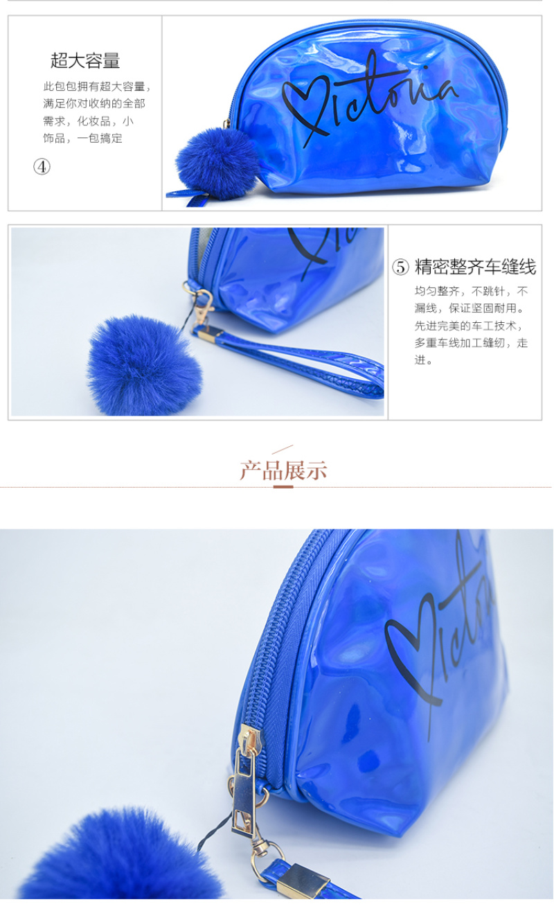 About Product:Laser shell package, this product is made of PVC Laser material, the surface is waterproof and easy to clean, PVC Laser is the most popular and hot shot design in recent years, the shell modeling, The printing and hair ball design is more practical with large capacity, suitable for skin care products and cosmetics. The printing can print The customer's own logo, color: Factory spot sales can invoice.
