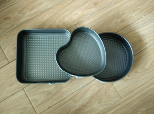 A non-stick cake mold with a height of 6.5CM, with dimensions of: square 26cm, round 24cm, and center 22cm. The color is gray. It is used for making cakes and pastries, and it is very convenient to remove the mold with a simple push. The removable bottom plate is rust-resistant and durable, with a high-temperature resistant non-stick coating for easy cleaning.