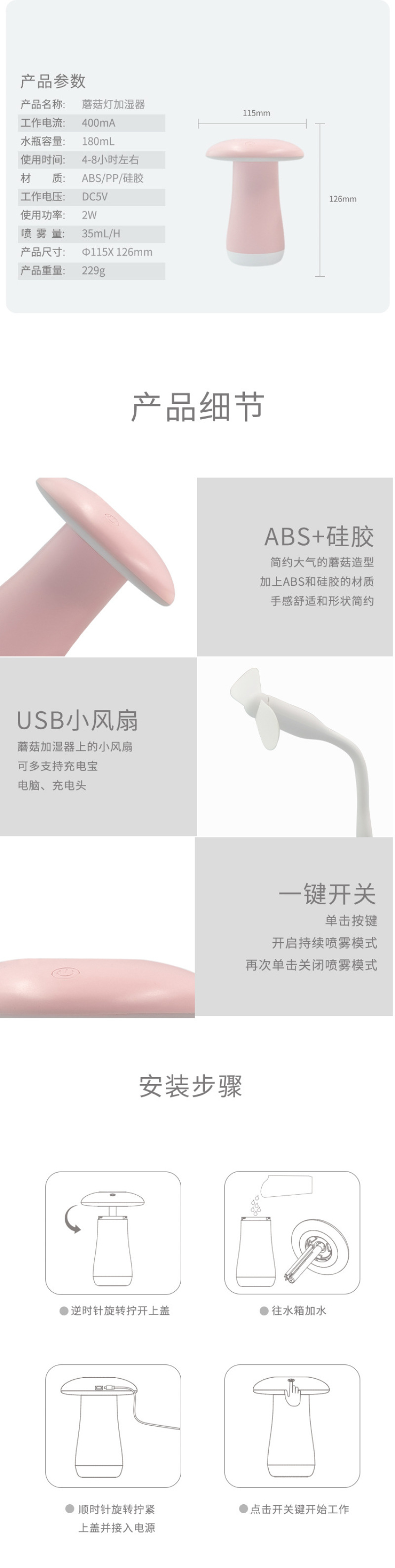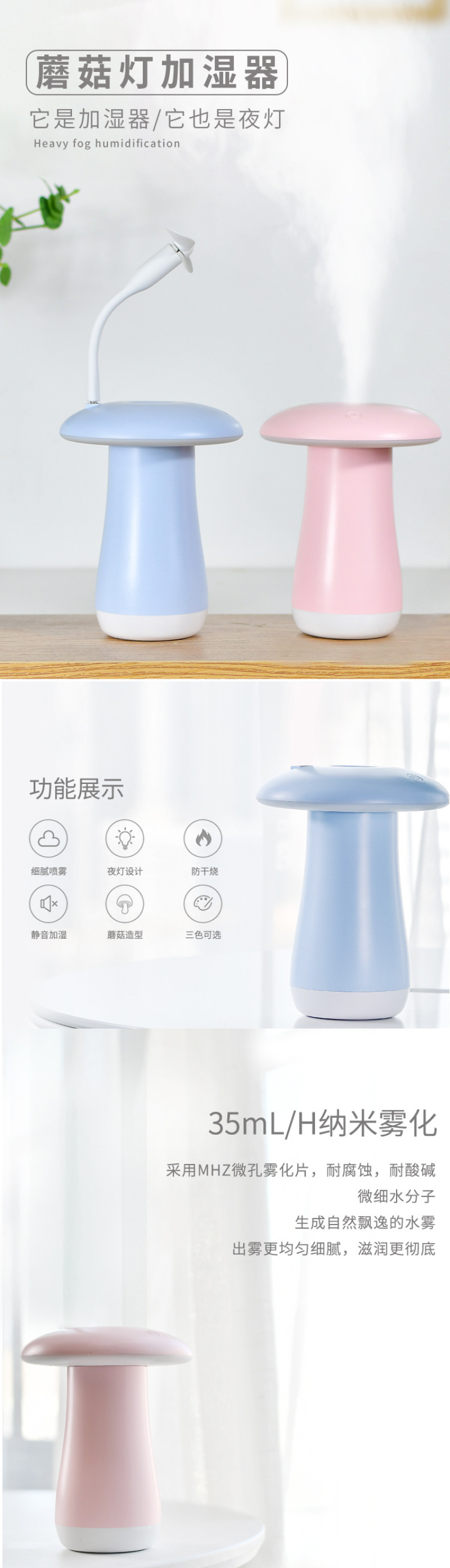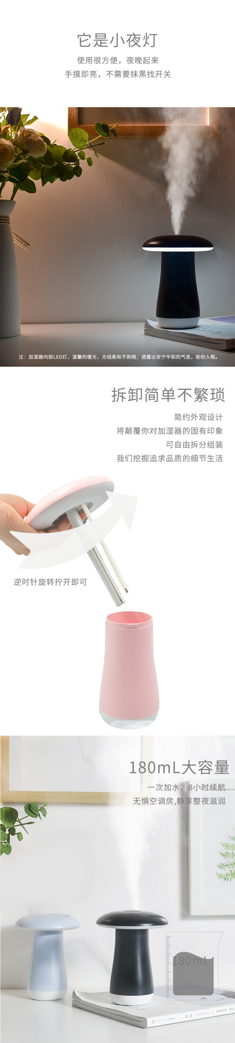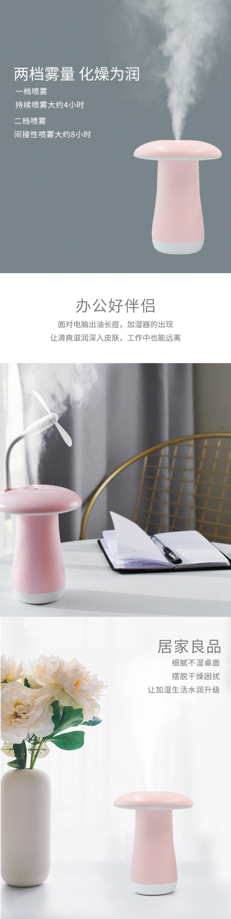 About Product:Nano atomizing humidifier, small night light, small fan, three in one.