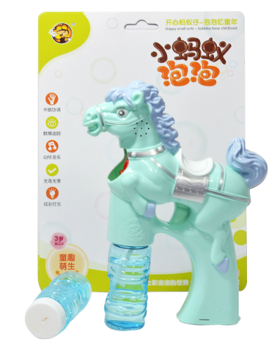 Real color pony bubble machine, bubble gun music light automatic blowing bubble toy, vacuum mold packaging, two bottles of bubble liquid