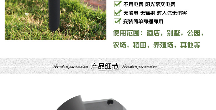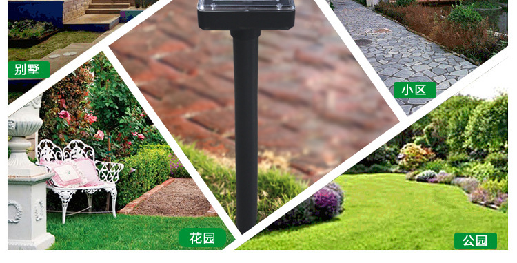 Product Description: Solar Snake Repellent and Mouse Repellent: I. Principle 1. It is charged by solar energy and can be used by discharging. 2. According to scientific research, animals are very sensitive to vibration, even the slightest vibration can be felt. Therefore, this product is based on the principle of emitting vibration waves, making them unable to stand and leaving the scene. II. Application This product is suitable for open fields, parks, and other open areas with a range of about 300 square meters. The closer it is, the better the effect. If the garden is large, using 2-3 products will be more effective. III. Product Description 1. It is equipped with special devices that spread sound and vibration waves through the land, making snakes and mice feel uncomfortable and thus leaving the scene to achieve the purpose of driving away; 2. It is powered by solar panels and is equipped with high-quality environmental-friendly rechargeable batteries, which can store sufficient electricity; 3. This product is convenient to install and has no radiation or damage to the human body, so it can be used at ease.