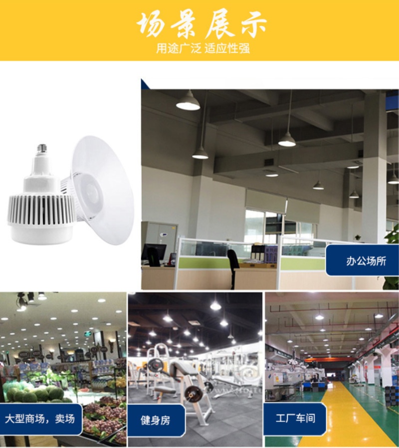 The product can be used in: warehouse, factory workshop, gym, large shopping malls and other spacious indoor lighting.