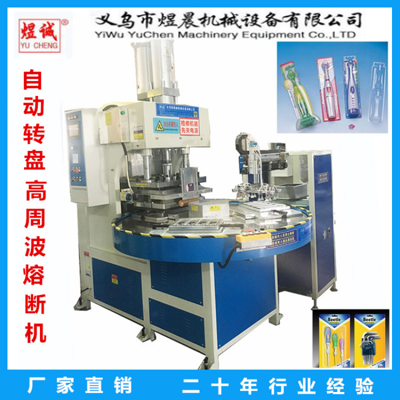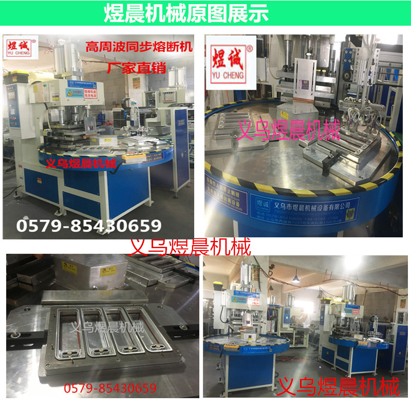 ★Automatic rotating disc high frequency fusing machine adopts precision splitter device and Taiwan motor drive. Automatic rotation, 3-6 stations can be selected, and the work efficiency is higher. The four stations of this machine work in turn, and the positioning of the stations is accurate. Automatic material taking and synchronous fusing function of manipulator. The cutting pressure of the fuse is 1-30 tons adjustable, and the electronic spark high frequency spark protection system has extremely high sensitivity to prevent burning loss by high-frequency molds. High frequency stabilizer and high frequency shielding device are provided to minimize high frequency interference and avoid radio wave interference. At the same time, the frequency drift caused by improper operation can be avoided, and the damage of electrodes and materials can be reduced to a minimum while the warning can be lit up warning light.