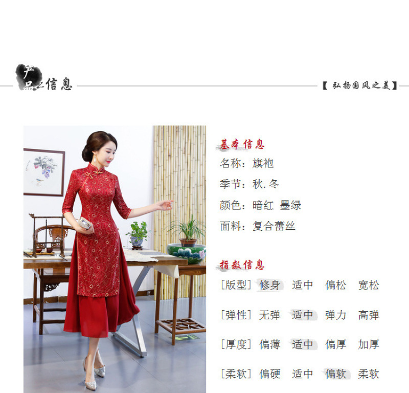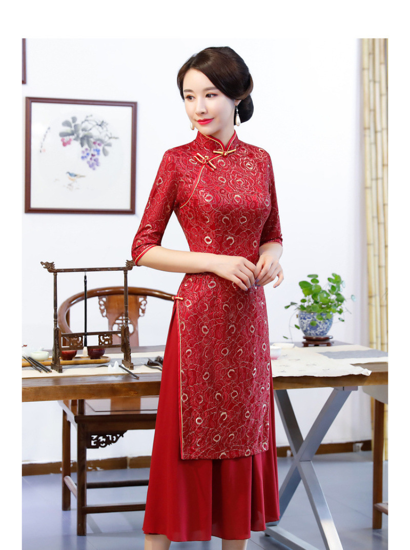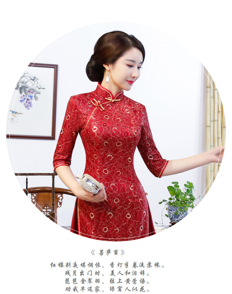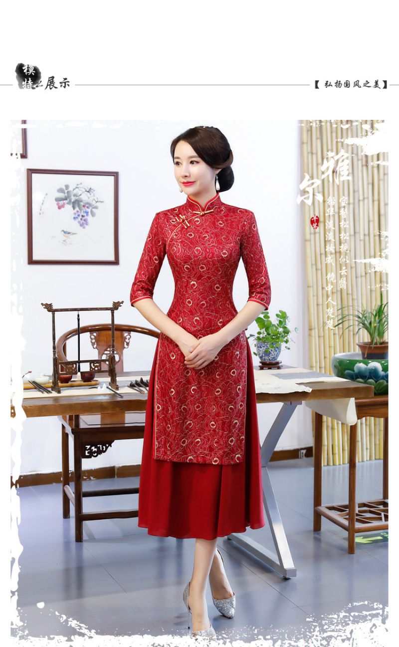 Women's autumn and winter new seven-minute sleeves ao dai cheongsam double layer compound lace wide edge A line dress 中文版