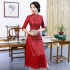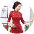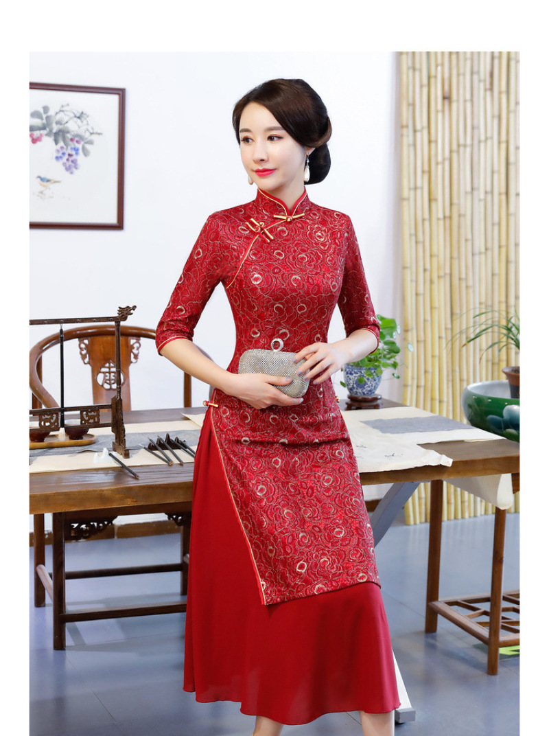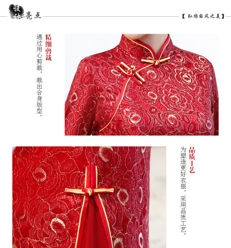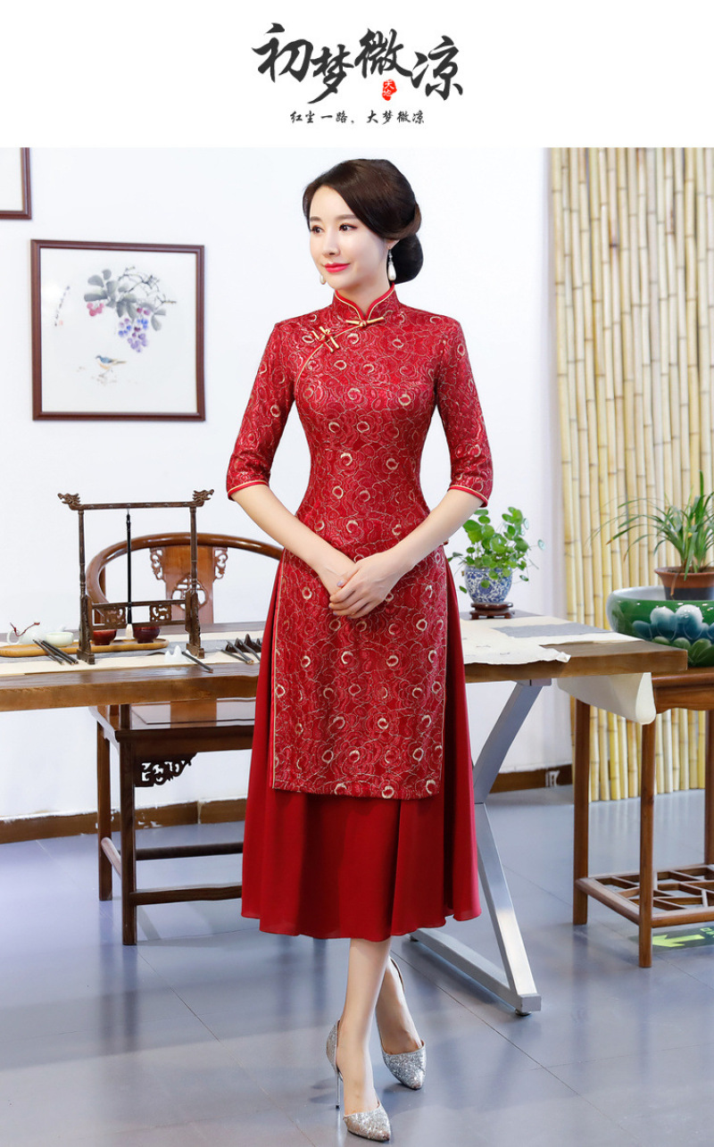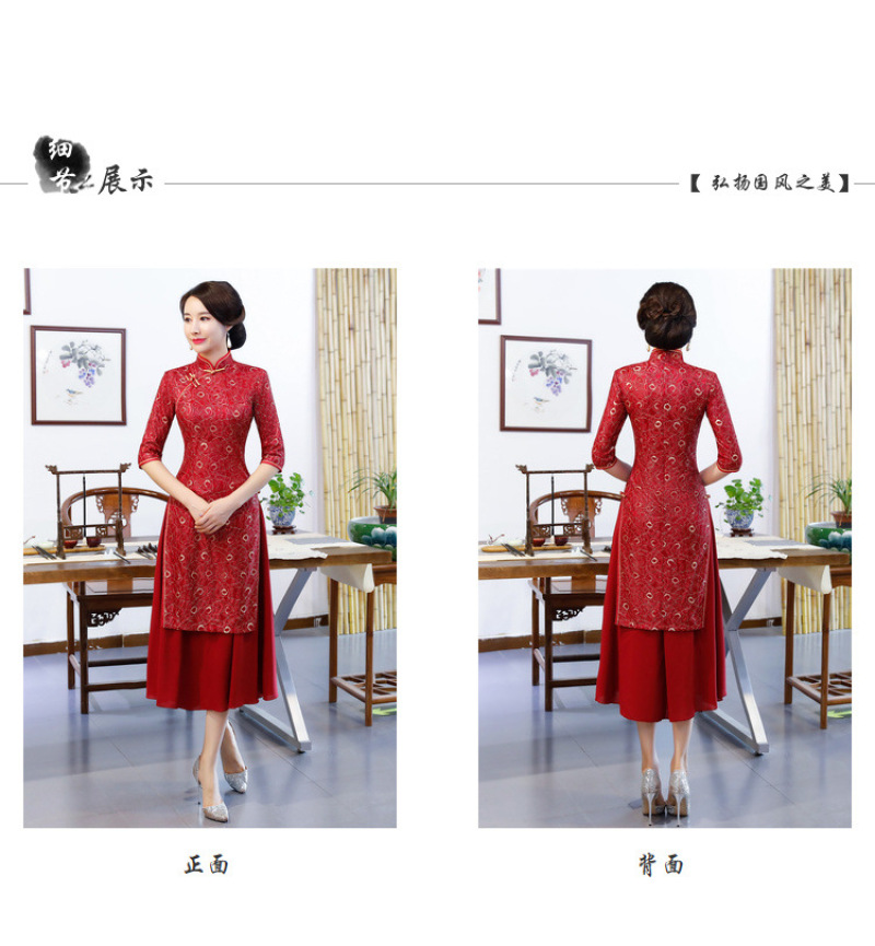 Women's autumn and winter new seven-minute sleeves ao dai cheongsam double layer compound lace wide edge A line dress 中文版