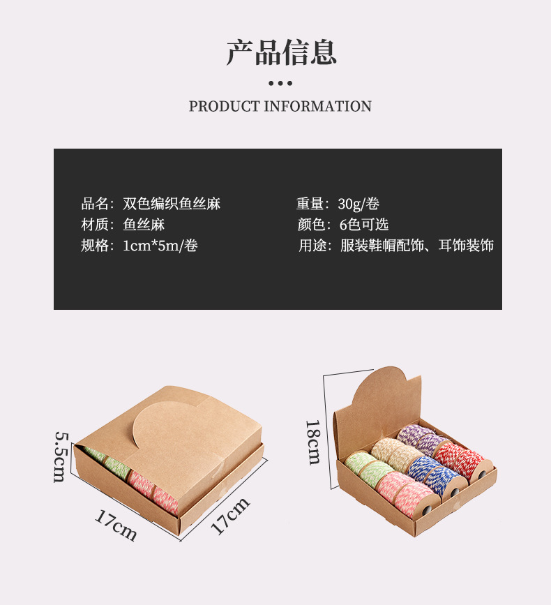 ?品名:彩色编织麻绳 材质:麻 规格:1cm*5m 此款麻绳为盒装销售,每盒12卷,6款颜色,精致纸盒包装,精致美观 另,此款麻绳我们也有散货销售,亲,可根据自己的需求选购哦 用途:彩色编织麻绳,颜色多样,亮丽,多用于时下最流行的创意编织耳饰, 样式新颖,很受欢迎哦,也可用于家居装饰,服装,鞋帽装饰等 可零买也可整盒买? 亲在拍单时注意看清