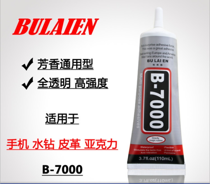 B7000Adhesives can adhere to a wider range of materials, including metals, glass, ceramics, stone, bamboo, wood, fabrics, leather, and more.PEandPPandPVCandABSNylon, sponge, film, fabric, electronic components, plastics, rubber, fibers, paper.Attach the phone frame, LCD screen, middle frame, frame, support, and so on.