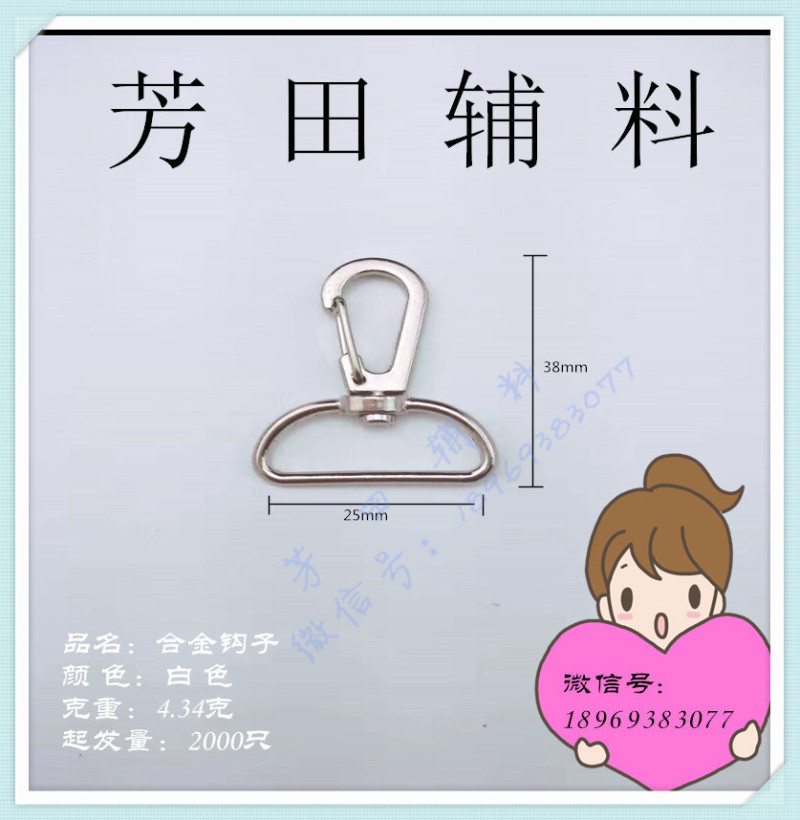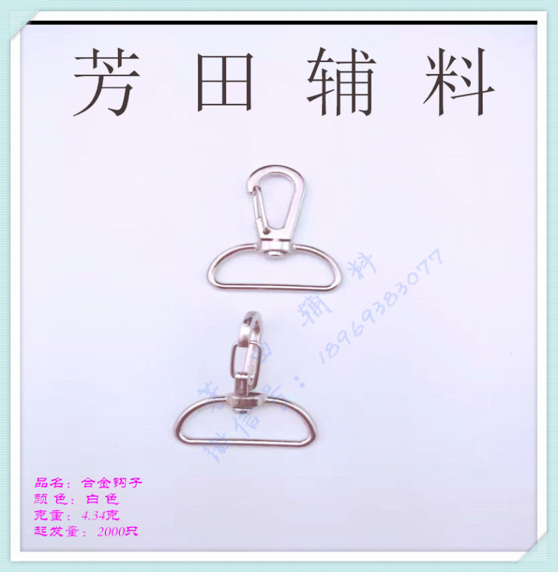 【Product Name】: White Alloy Pet Buckle Dog Buckle Hook Buckle Lacing Buckle Hanger Buckle Key Buckle with an Inner Diameter of 25mm 【Product Model】: 25 Inner Diameter 【Length and Width Dimensions】: Total Length: 38mm 【Product Material】: Alloy 【Product Color】: White, other colors can be customized. |