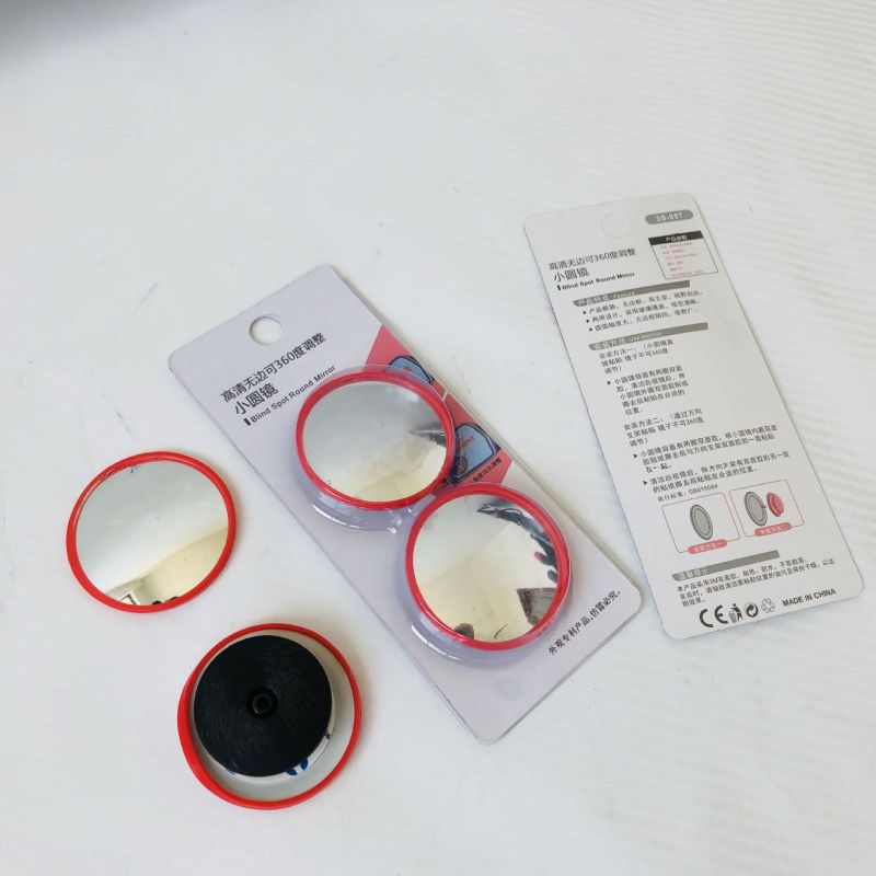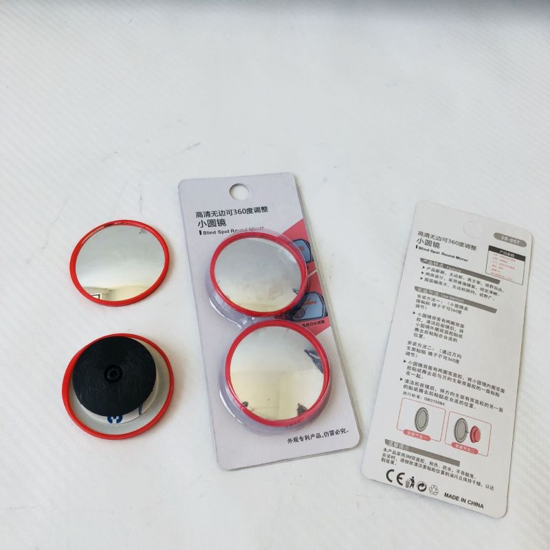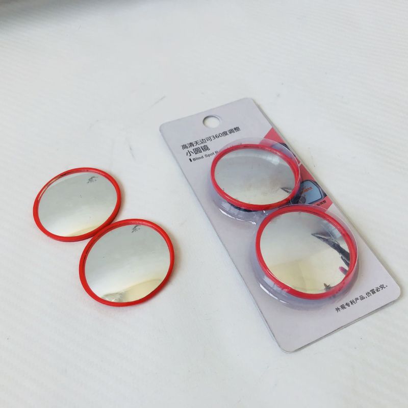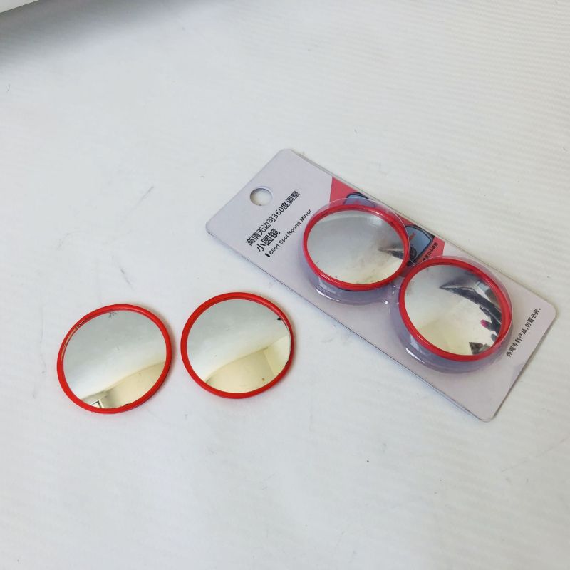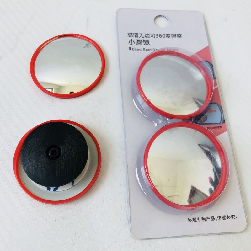 Red-framed small round mirror with 360-degree adjustable wide-angle view for car blind spot assistance and reverse parking with rotating reflective glass
