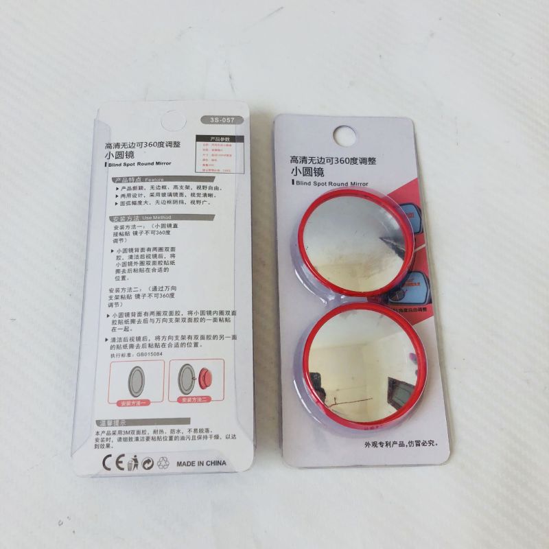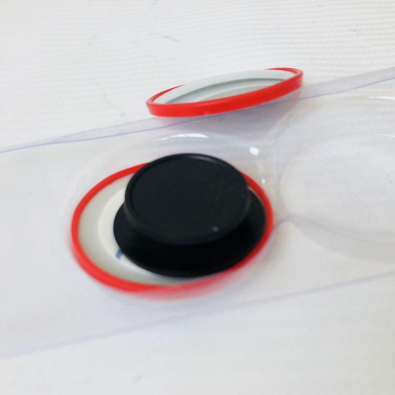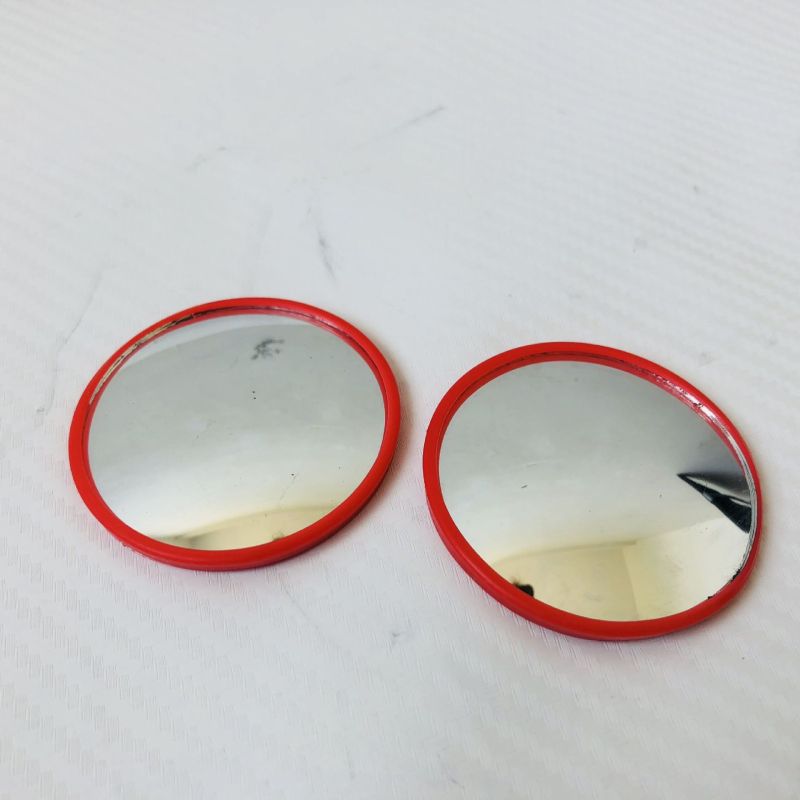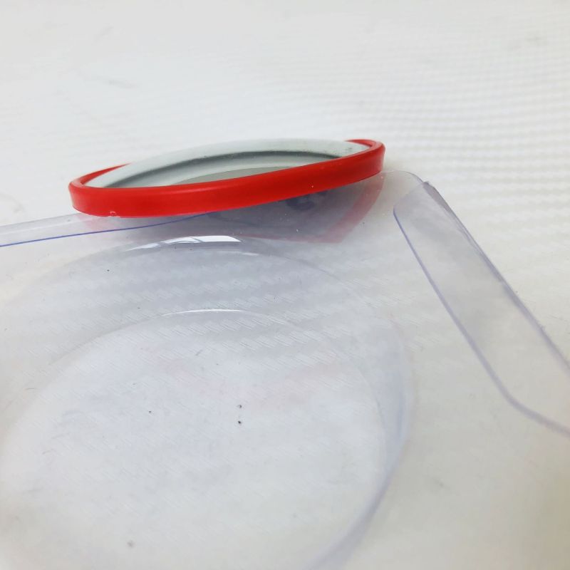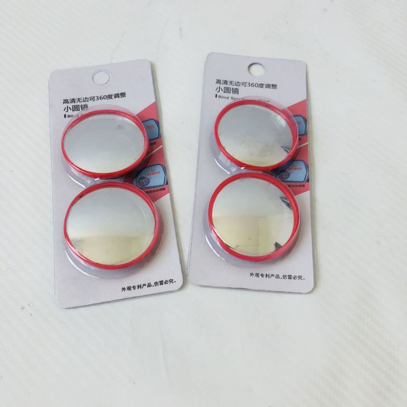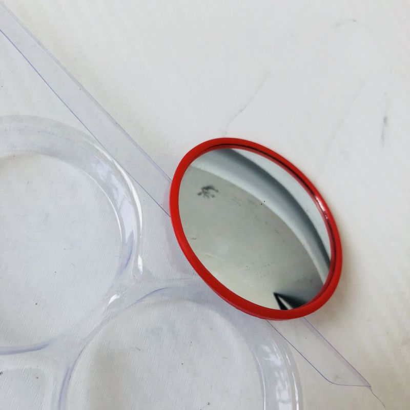 Red-framed small round mirror with 360-degree adjustable wide-angle view for car blind spot assistance and reverse parking with rotating reflective glass