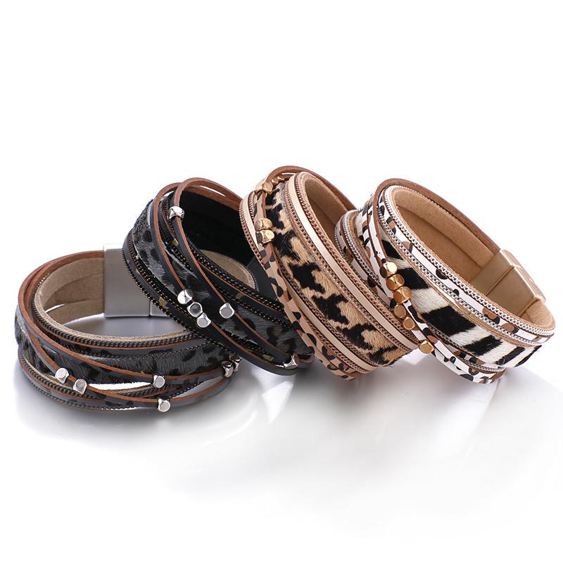 Cross-border European and American popular fall and winter models of magnetic clasp leopard print bracelets, fashion bracelets, genuine leather horse hair bracelets