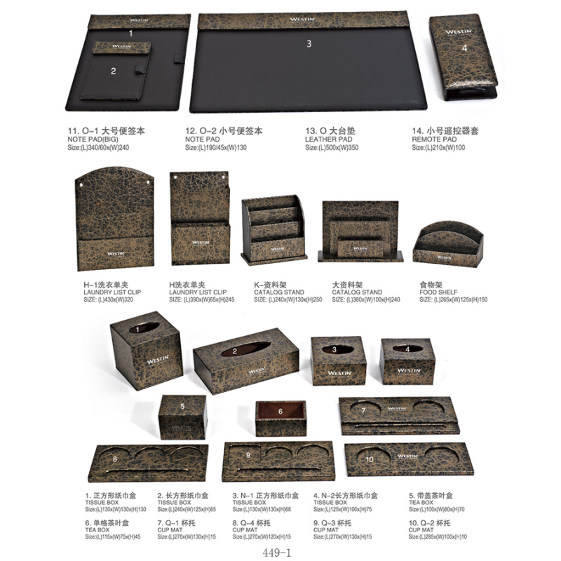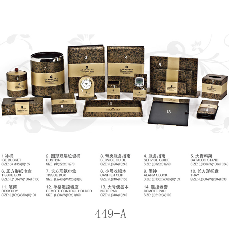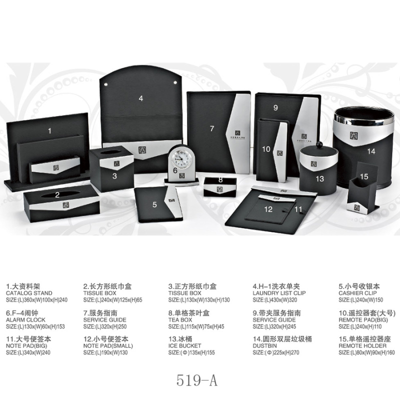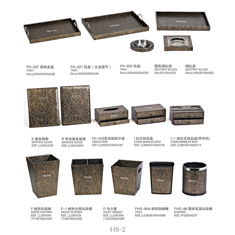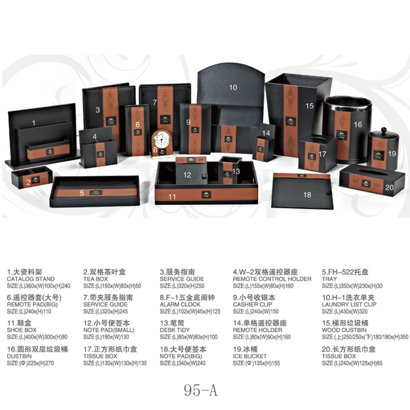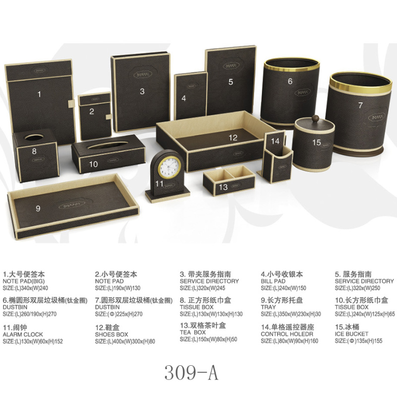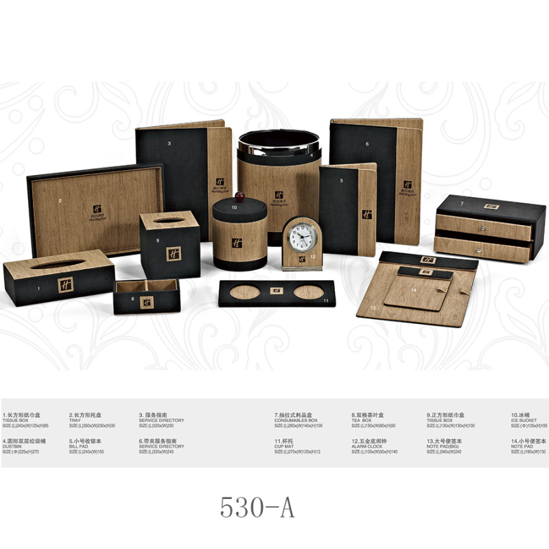 two:Hotel room supplies (hotel leather goods products, hotel acrylic products, mini-fridge, safe, hair dryer, electric kettle, towel basket, trash bin)