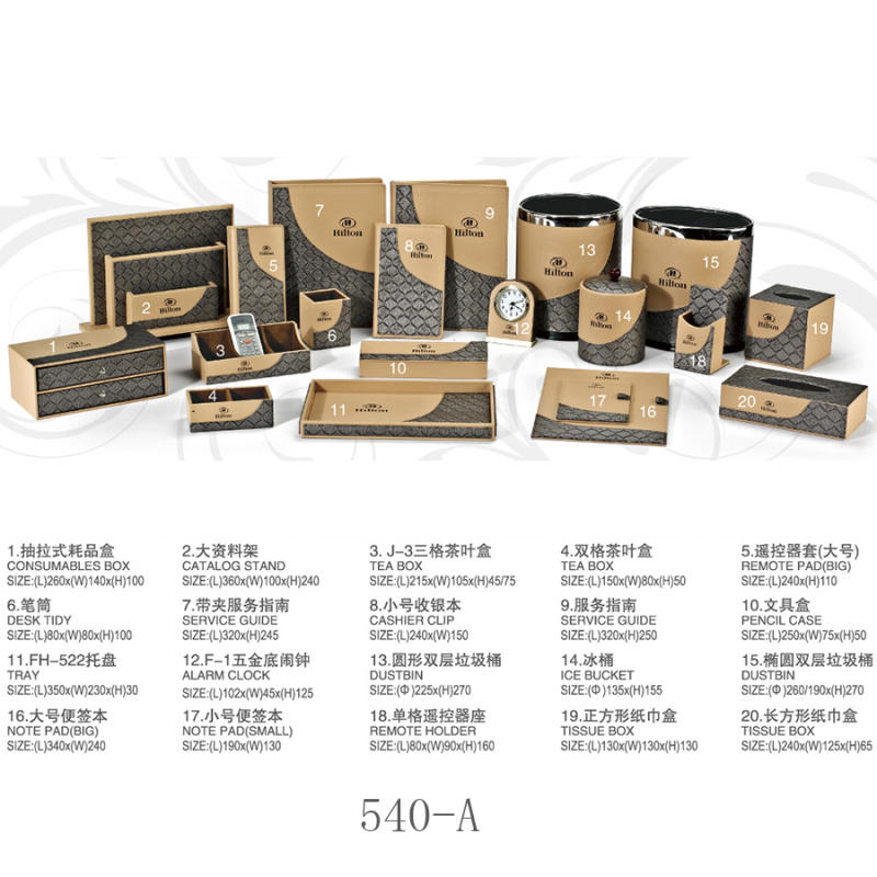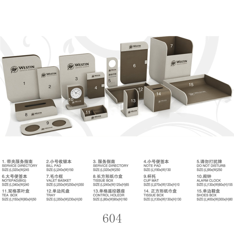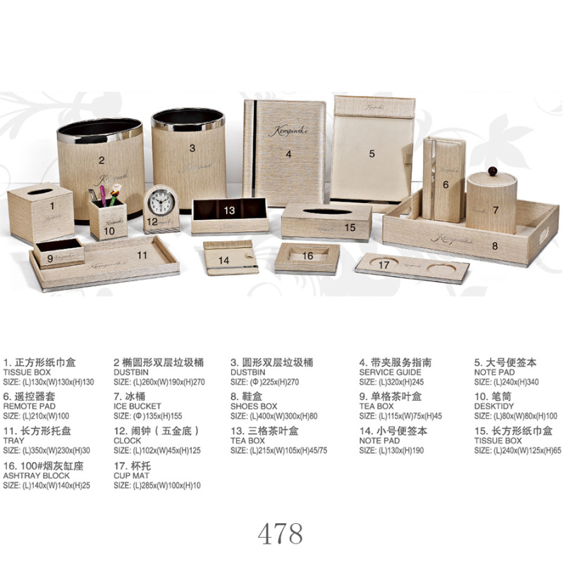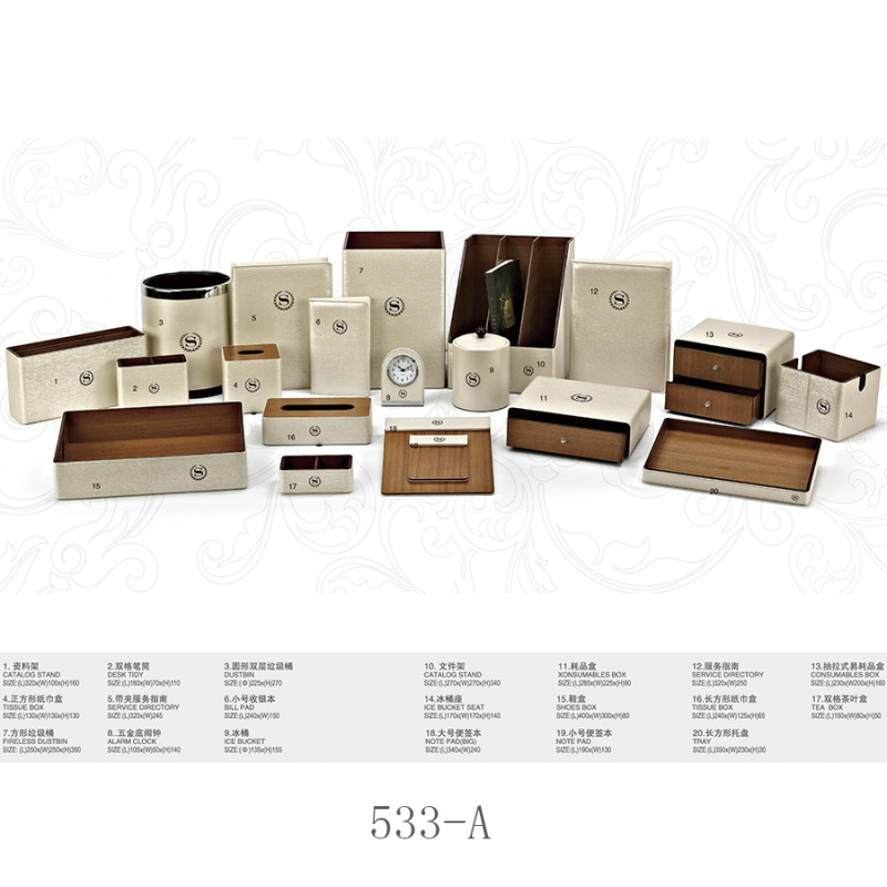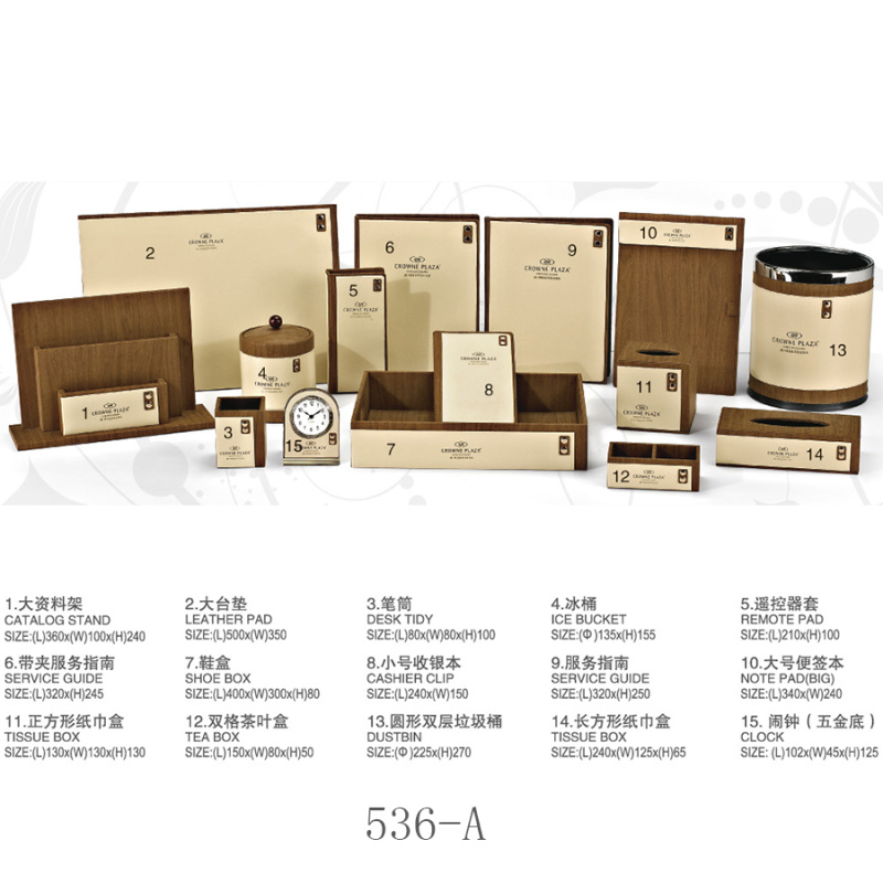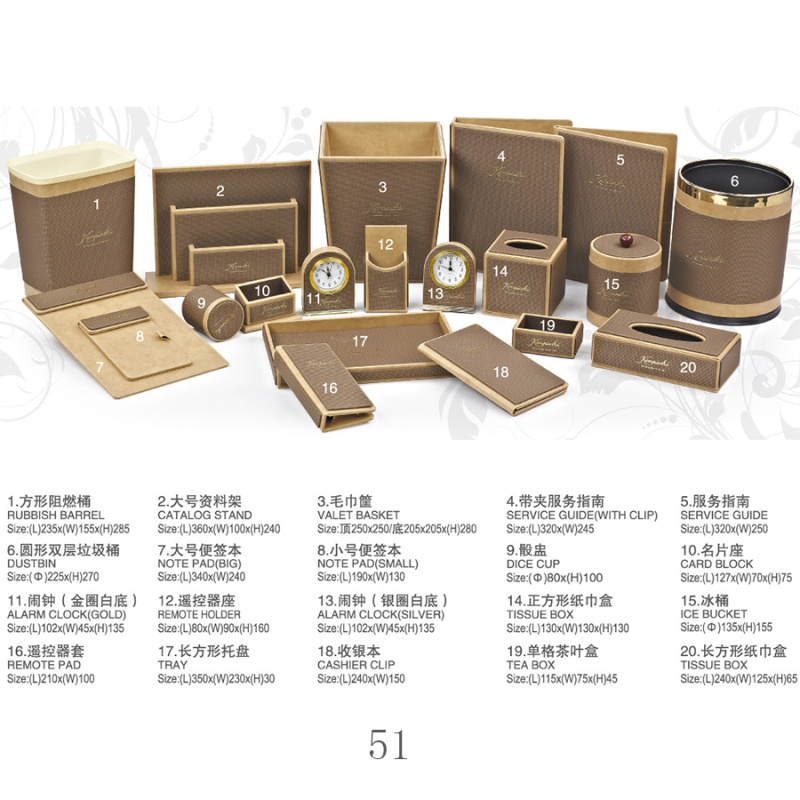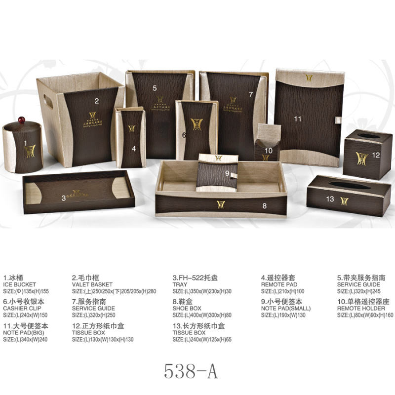twoHotel room supplies (hotel leather goods products, hotel acrylic products, mini-fridge, safe, hair dryer, electric kettle, towel basket, trash bin)
