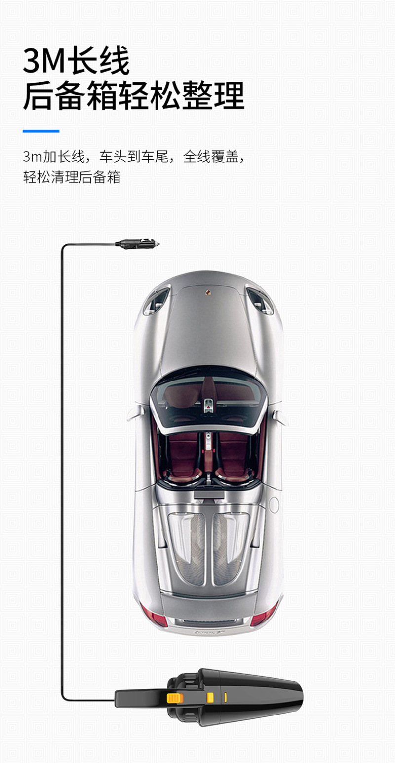 3. Change the suction nozzle according to different occasions, and connect line of cigarette lighter about 4.5 meters long, which is enough to cover any position inside the vehicle;