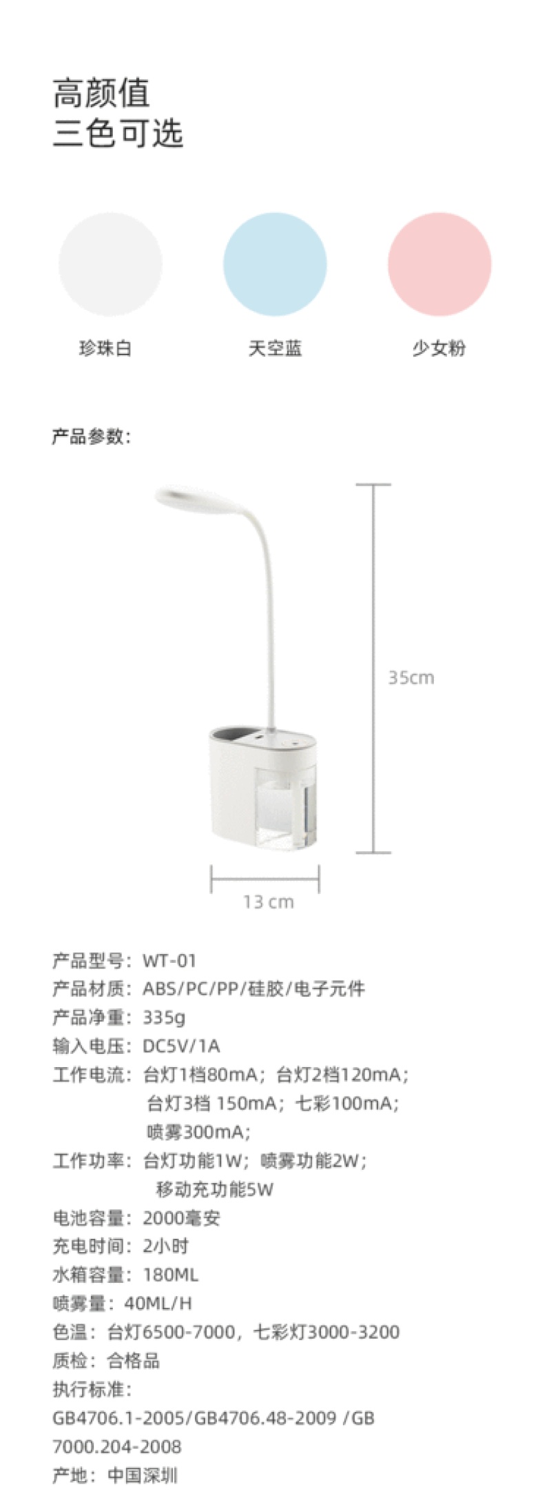 | Input voltage: | DC5V/1A | Working current: | Desk lamp 1 gear 80mA/desk lamp 2 gear 120mA/desk lamp 3 gear 150mA. Colorful lights 100mA. Spray 300mA. |