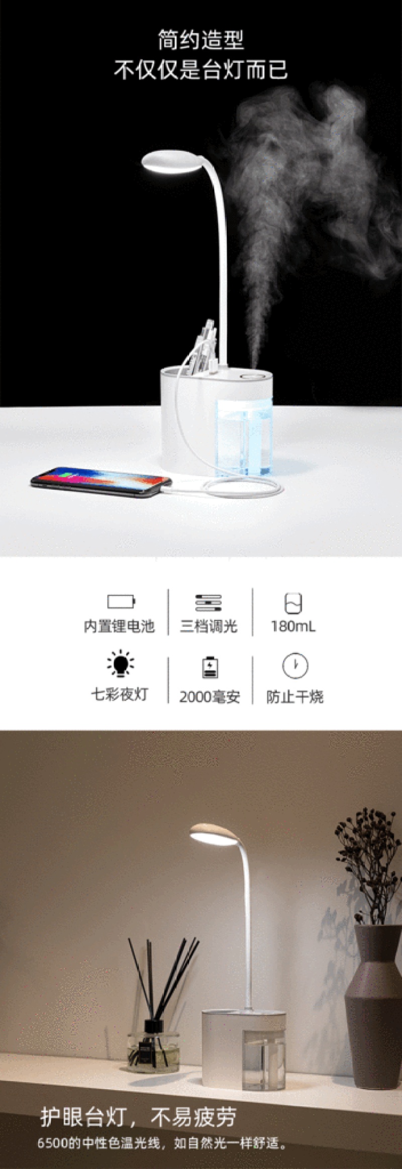 1. Table lamp function: table lamp 1 gear 20 hours, 2 Gear 15 hours, 3 gear 12 hours. 2. Spray function: continuous spray timing for 4 hours, indirect spray timing for 8 hours. 3. Table lamp + spray function is used for about 4 hours |
